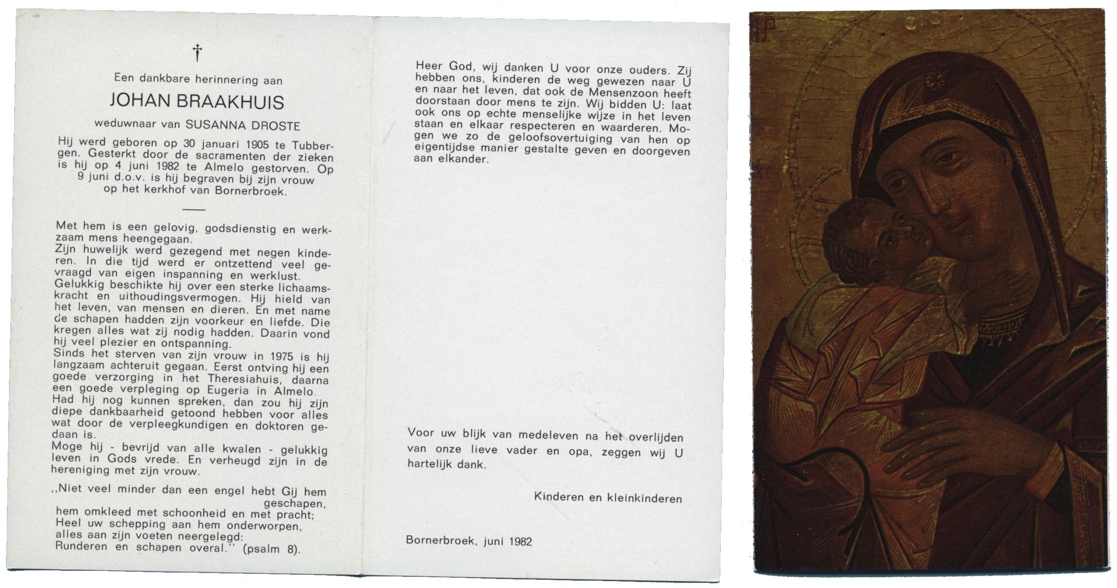 BRAAKHUIS, Johan, geboren op 30-1-1905 te Tubbergen, overleden op 4-6-1982 te Almelo op 77-jarige leeftijd, begraven op 9-6-1982 te Bornerbroek.