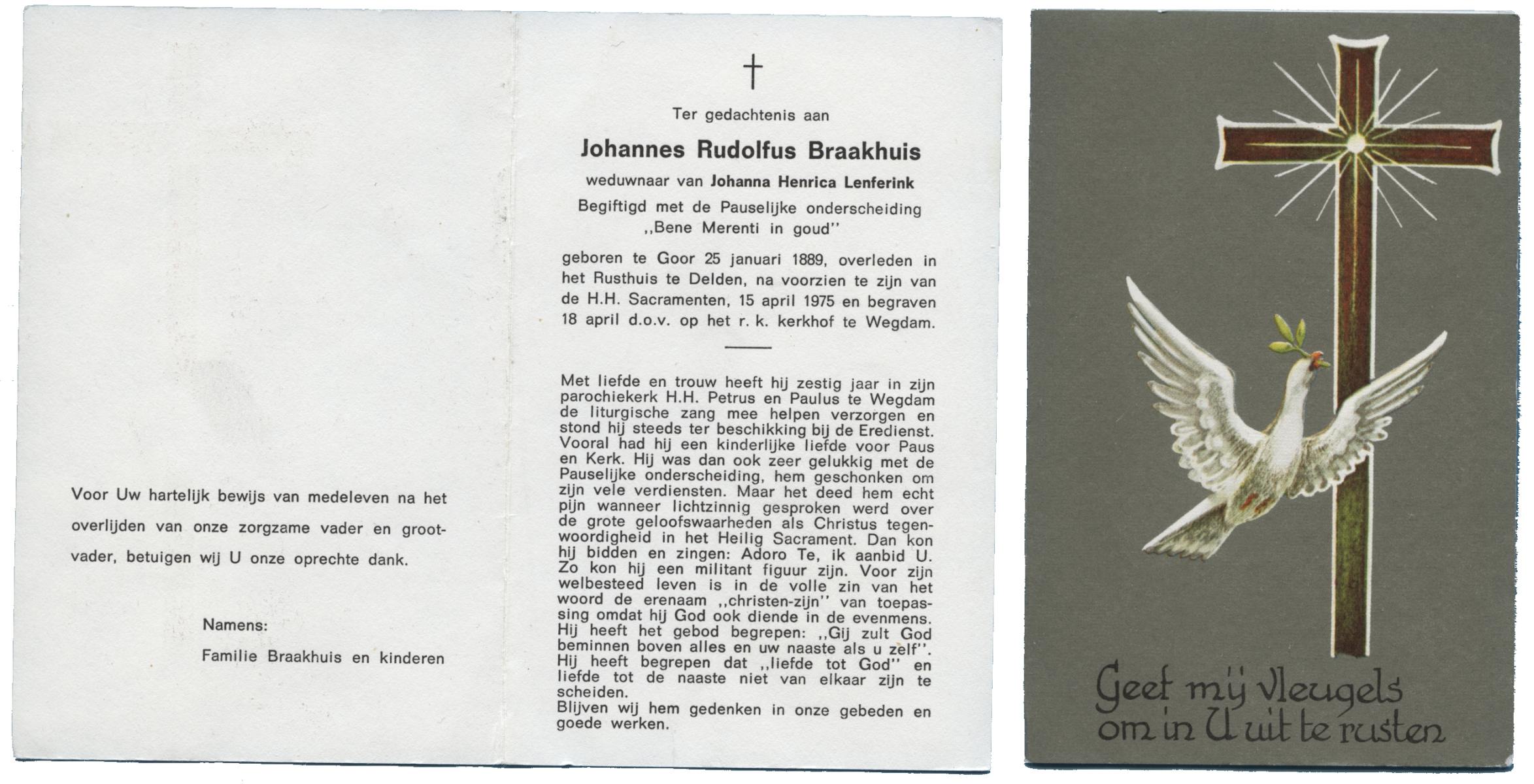 BRAAKHUIS, Johannes Rudolfus, geboren op 25-01-1889 te Goor, overleden op 15-4-1975 te Delden op 86-jarige leeftijd, begraven op 18-4-1975 te Wegdam.