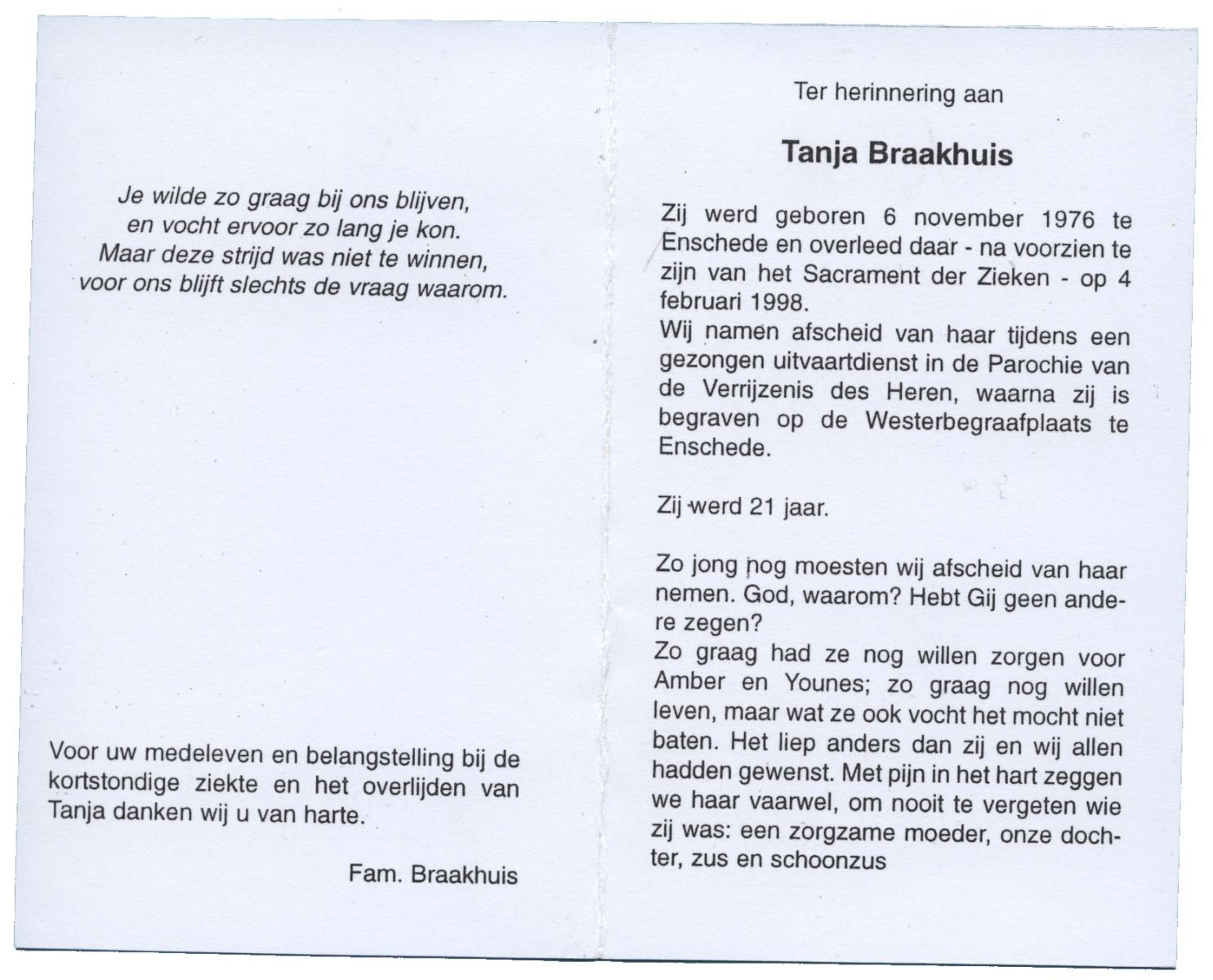 BRAAKHUIS, Tanja, geboren op 6-11-1976 te Enschede, overleden op 4-2-1998 op 21-jarige leeftijd, begraven te Enschede.