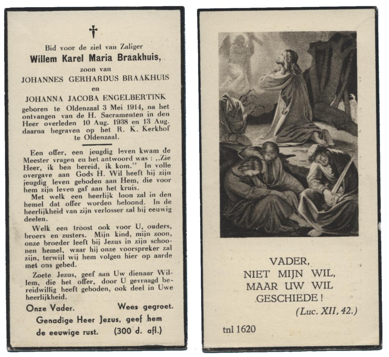 BRAAKHUIS, Willem Karel Maria, geboren op 3-3-1914 te Oldenzaal, overleden op 10-8-1938 op 24-jarige leeftijd, begraven op 13-8-1938 te Oldenzaal.