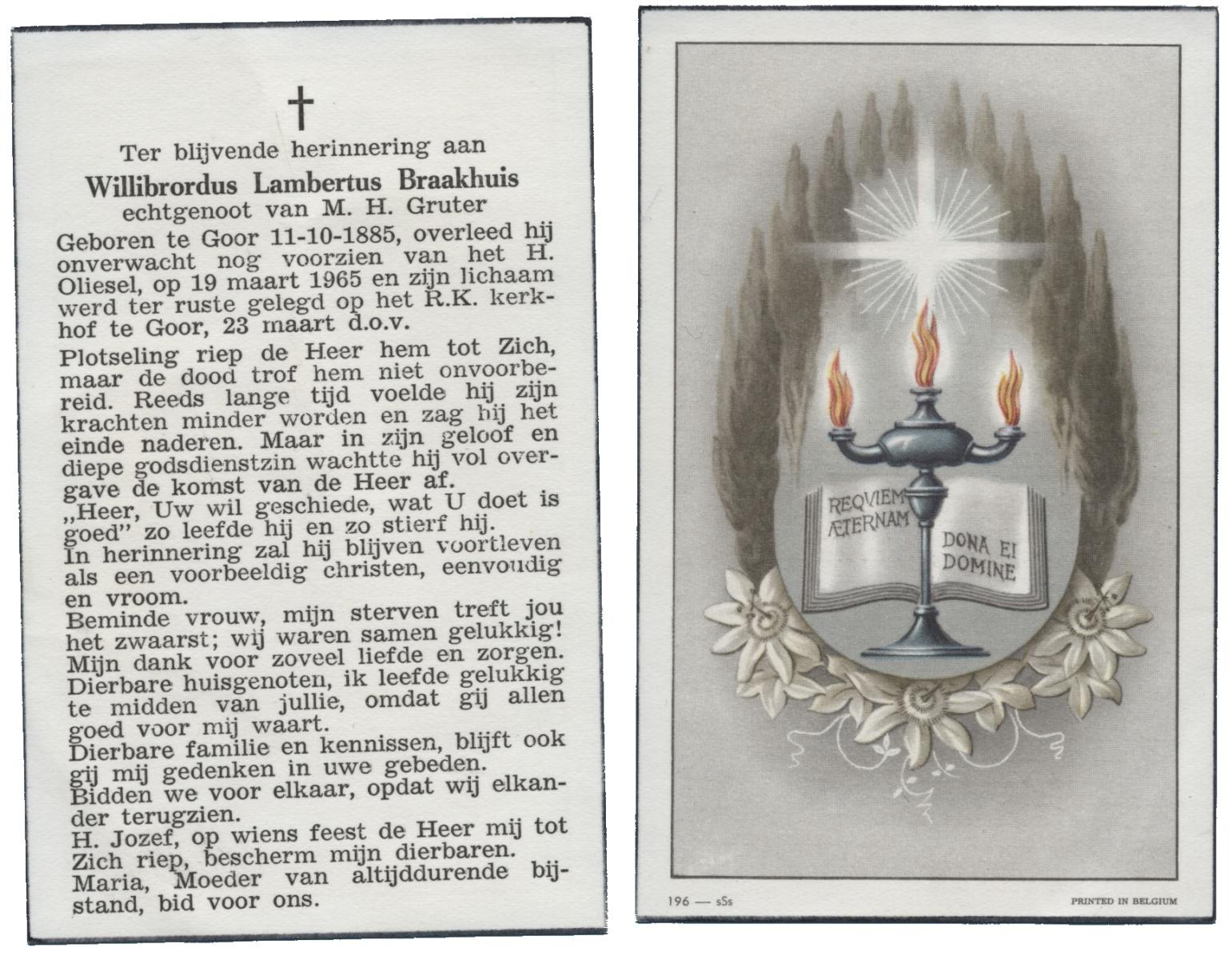 BRAAKHUIS, Willibrordus Lambertus, geboren op 11-10-1885 te Goor, overleden op 19-3-1965 te Goor op 79-jarige leeftijd, begraven op 23-3-1965 te Goor.