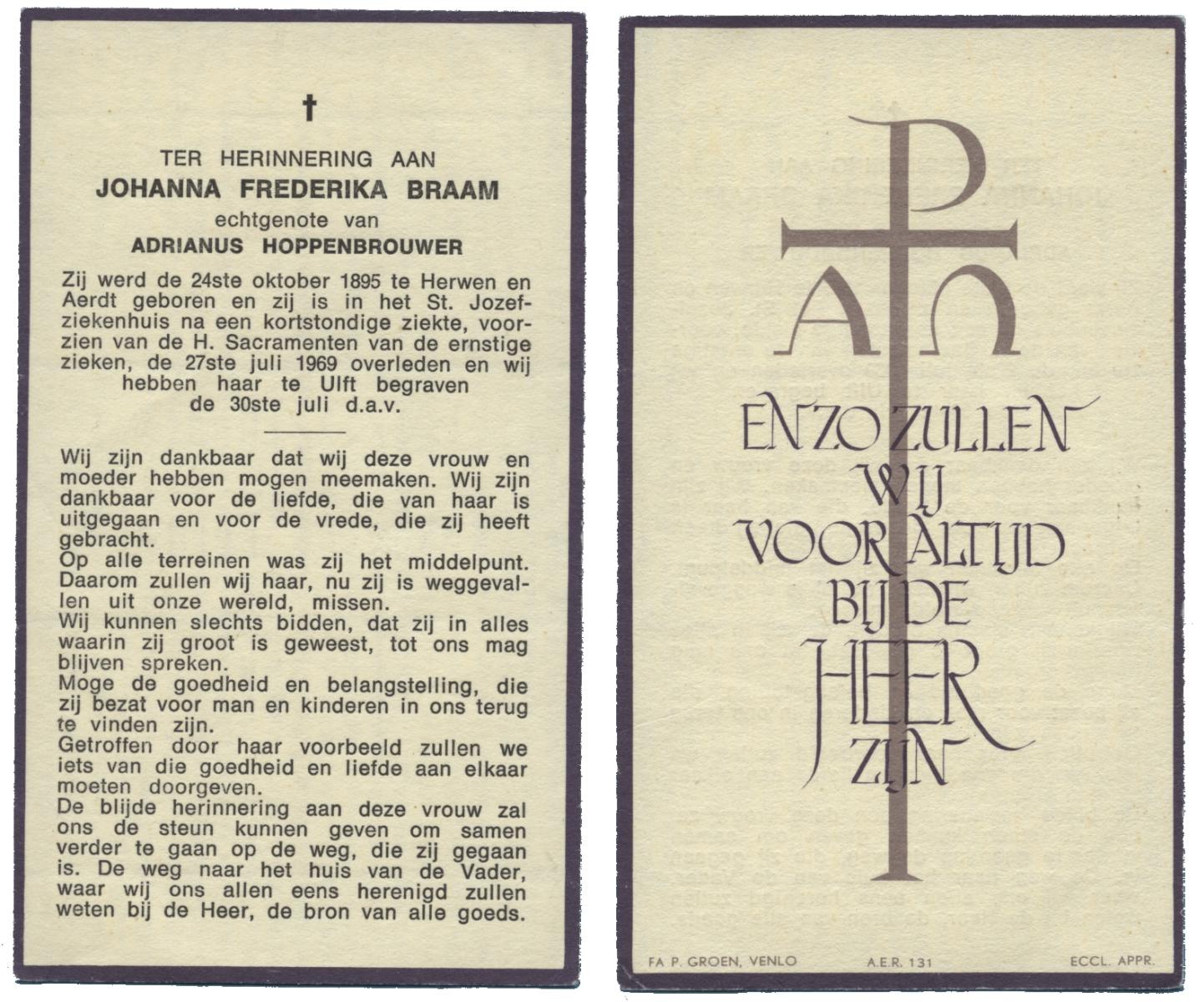 BRAAM, Johanna Fredrika, geboren op 24-10-1895 te Herwen en Aerdt, overleden op 27-7-1969 op 74-jarige leeftijd, begraven op 30-7-1969 te Ulft.