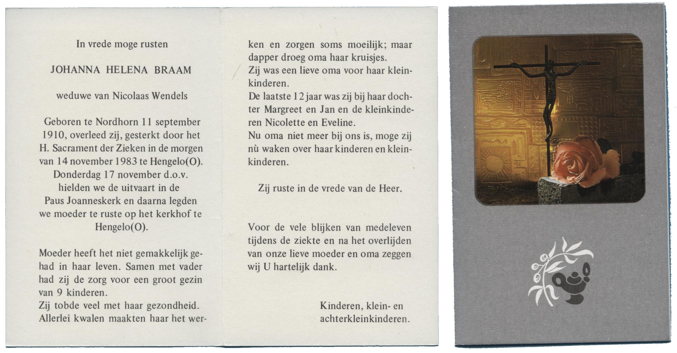 BRAAM, Johanna Helena, geboren op 11-9-1910 te Nordhorn (Dld.), overleden op 14-11-1983 te Hengelo (Ov.) op 73-jarige leeftijd, begraven op 17-11-1983 te Hengelo (Ov.).