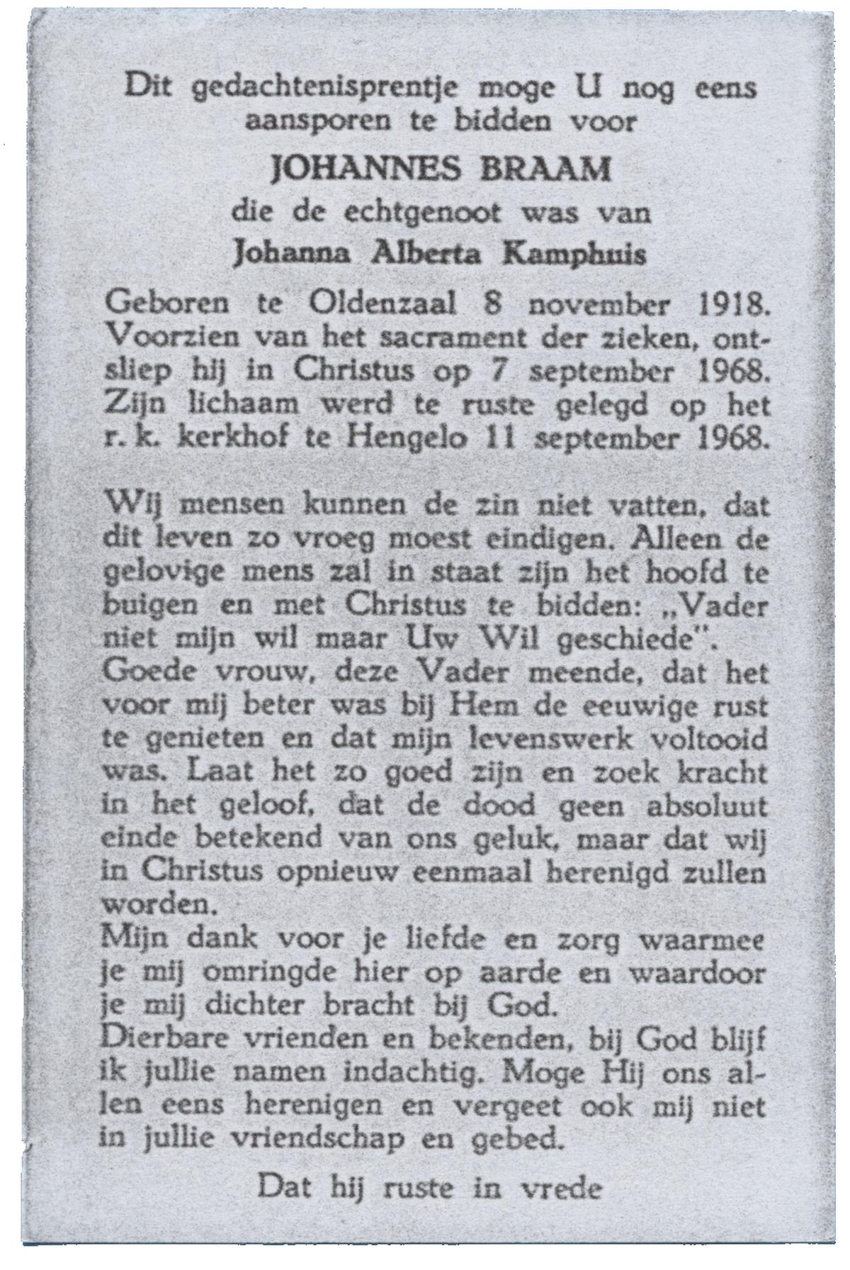 BRAAM, Johannes, geboren op 8-11-1918 te Oldenzaal, overleden op 7-9-1968 op 49-jarige leeftijd, begraven op 11-9-1968 te Oldenzaal.