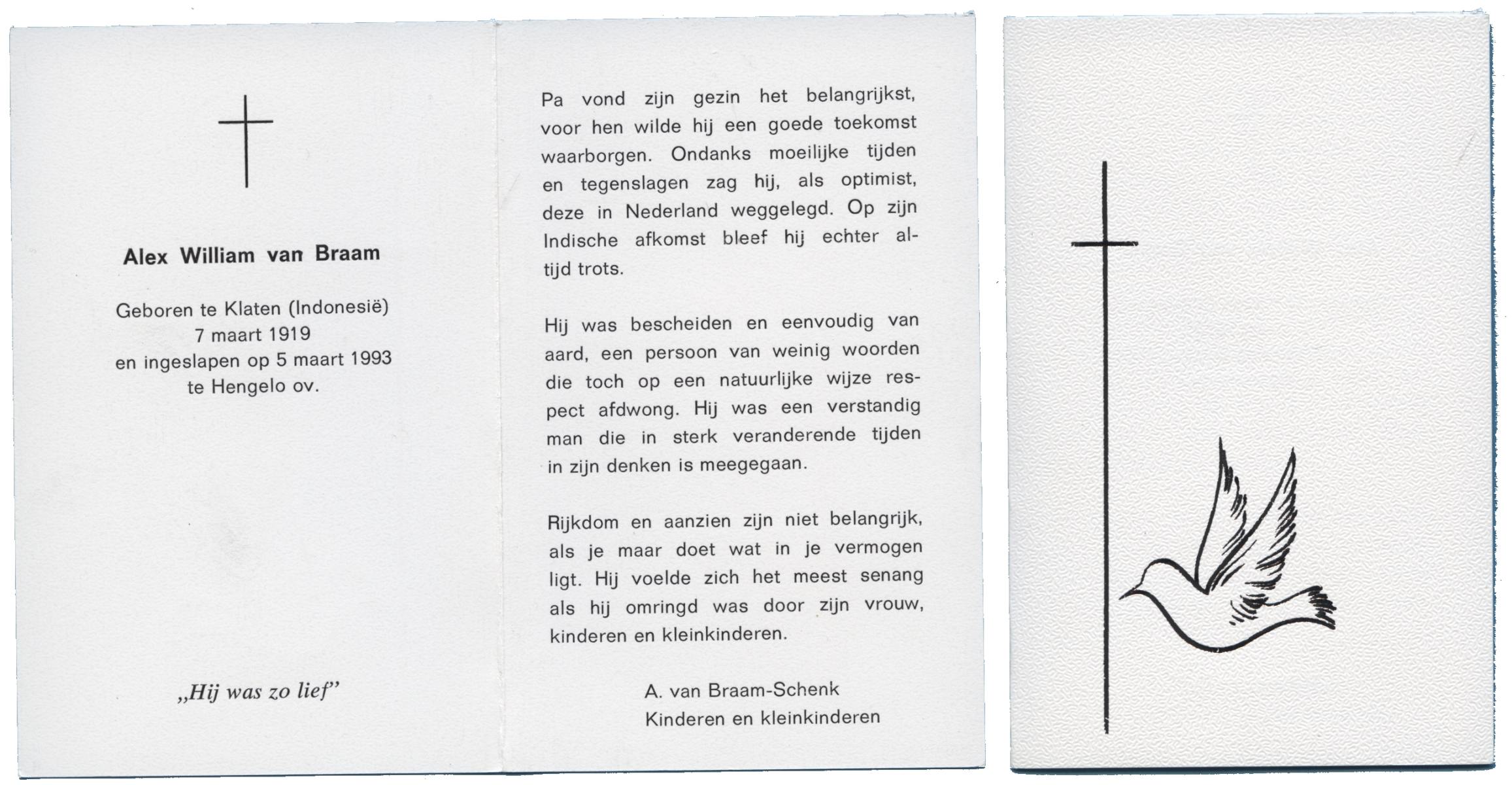 BRAAM, van, Alex William, geboren op 7-3-1919 te Klaten, Indon., overleden op 5-3-1993 te Hengelo (Ov.) op 73-jarige leeftijd.