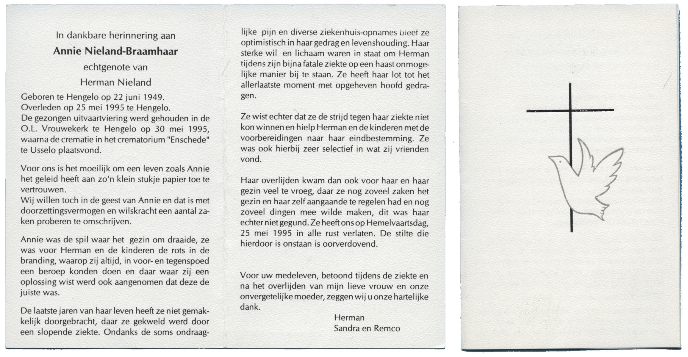 BRAAMHAAR, Annie, geboren op 22-6-1949 te Hengelo (O), overleden op 25-5-1995 te Hengelo (Ov.) op 45-jarige leeftijd, gecremeerd op 30-5-1995 te Usselo.