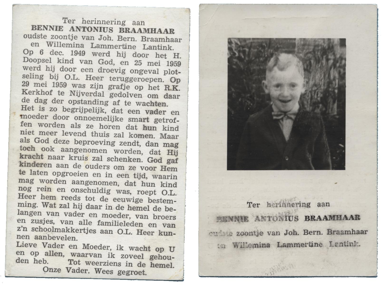 BRAAMHAAR, Bennie Antonius, geboren op 6-12-1949, overleden op 25-5-1959 te Hellendoorn, Nijverdal op 9-jarige leeftijd, begraven op 29-5-1959 te Hellendoorn, Nijverdal.