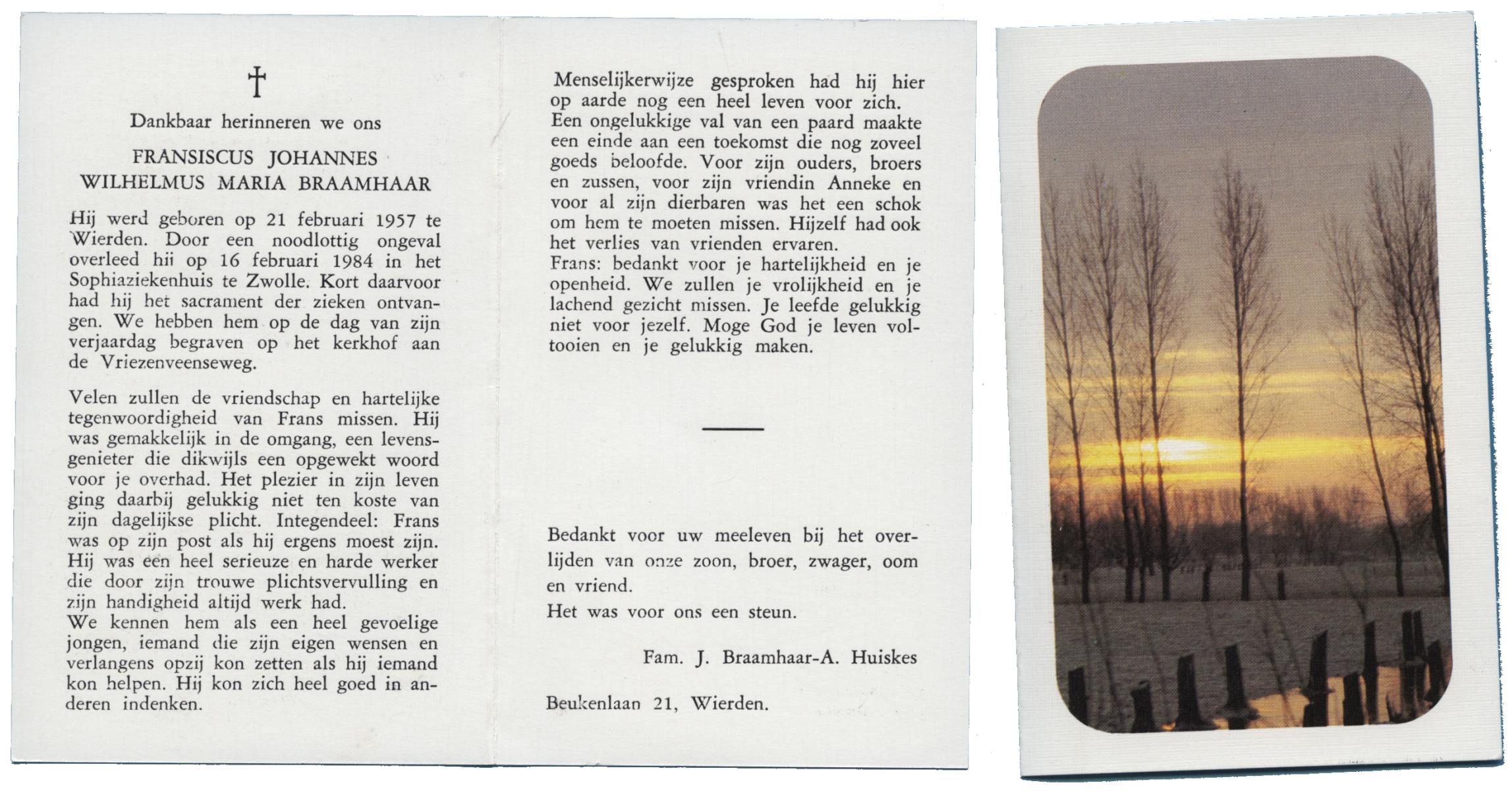 BRAAMHAAR, Franciscus Johannes Wilhelmus, geboren op 21-2-1957 te Wierden, overleden op 16-2-1984 te Zwolle op 26-jarige leeftijd, begraven op 21-2-1984 te Wierden.