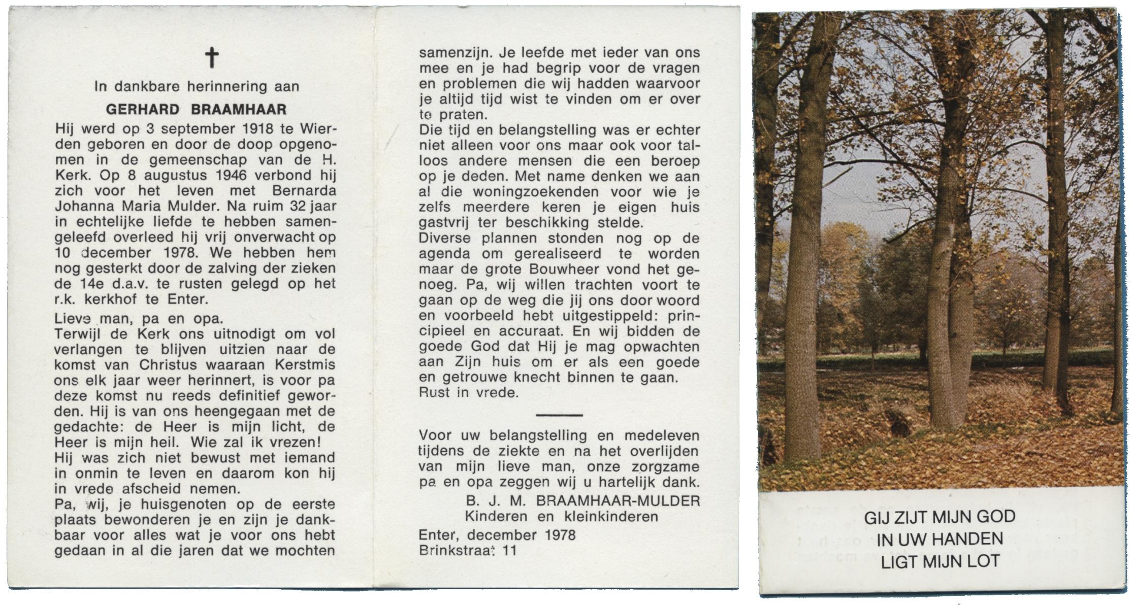 BRAAMHAAR, Gerhard, geboren op 3-9-1918 te Wierden, overleden op 10-12-1978 te Enter op 60-jarige leeftijd, begraven op 14-12-1978 te Enter.