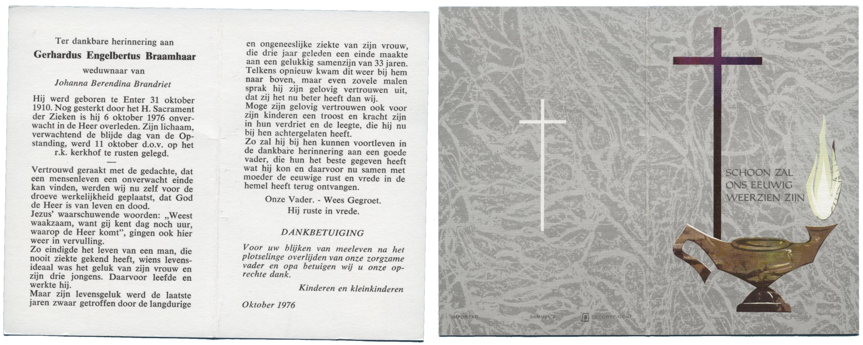 BRAAMHAAR, Gerhardus Engelbertus, geboren op 31-10-1910 te Enter, overleden op 6-10-1976 te Enschede op 65-jarige leeftijd, begraven op 11-10-1976 te Enter.