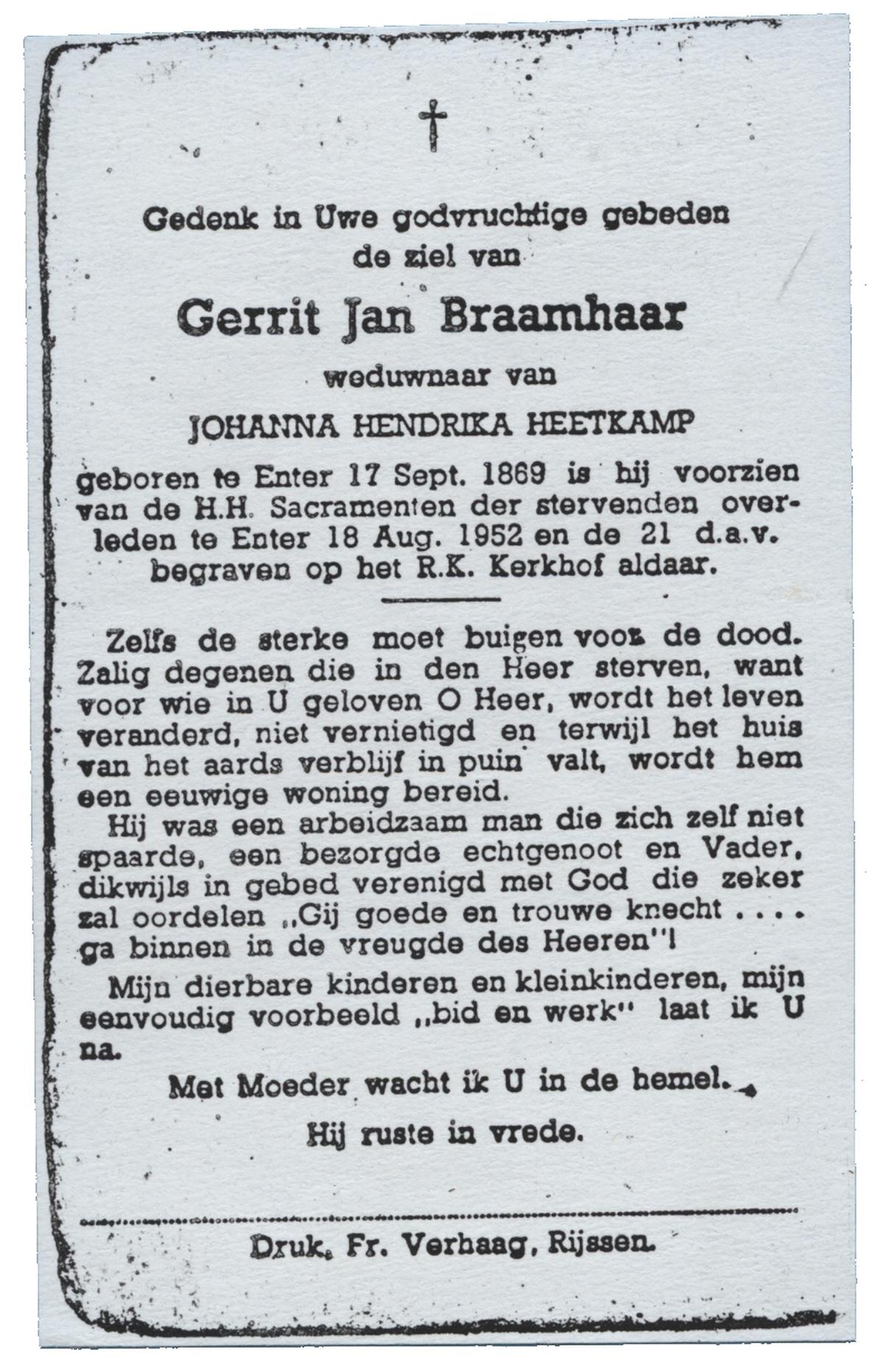 BRAAMHAAR, Gerrit Jan, geboren op 17-09-1869 te Enter, overleden op 18-8-1952 te Enter op 82-jarige leeftijd, begraven op 21-8-1952 te Enter.