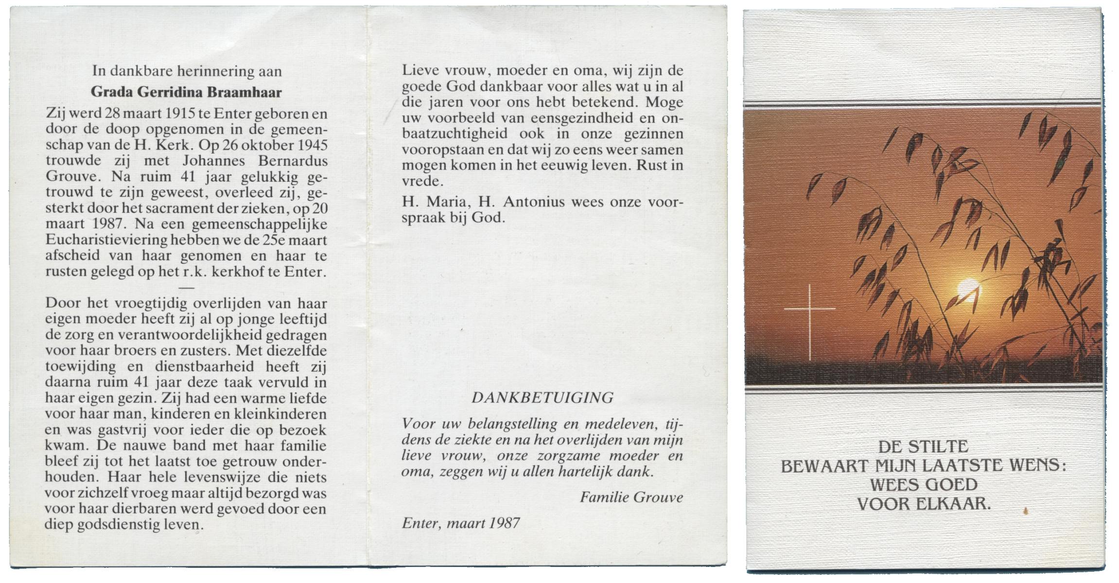 BRAAMHAAR, Grada Gerridina, geboren op 28-3-1915 te Wierden, Enter, overleden op 20-3-1987 op 71-jarige leeftijd, begraven op 25-3-1987 te Wierden, Enter.