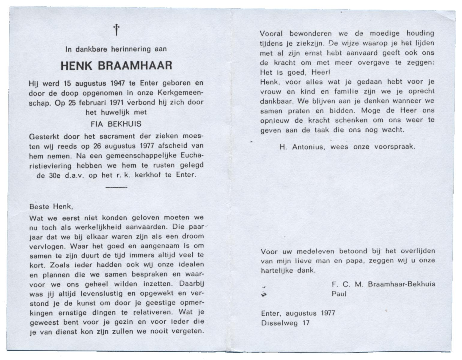 BRAAMHAAR, Henk, geboren op 15-8-1947 te Enter, overleden op 26-8-1977 te Enter op 30-jarige leeftijd, begraven op 30-8-1977 te Enter.
