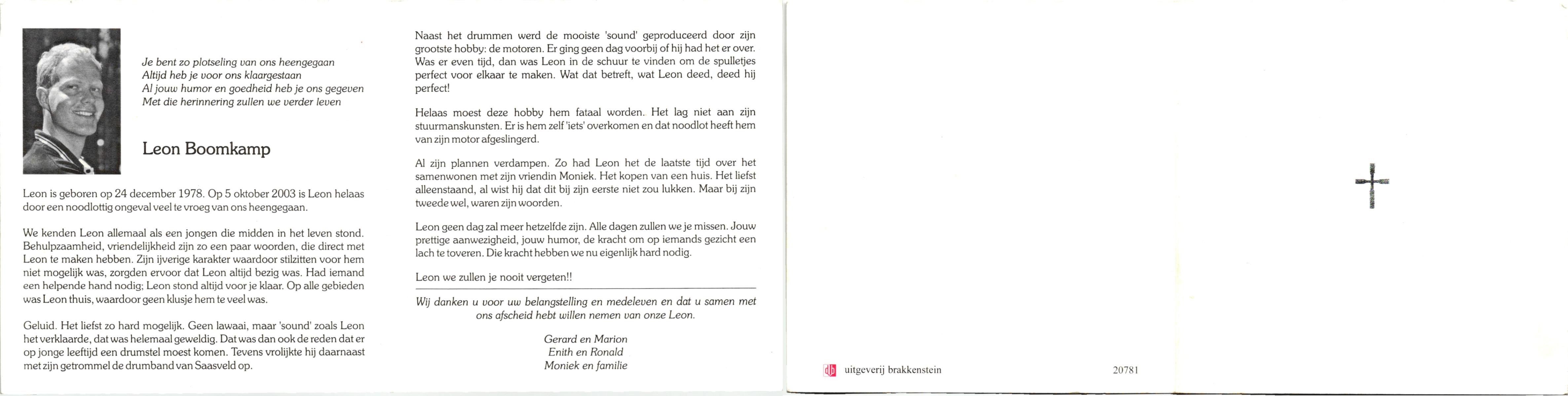 BOOMKAMP, , Leon, geboren op 24-12-1978, overleden op 5-10-2003 op 25-jarige leeftijd.