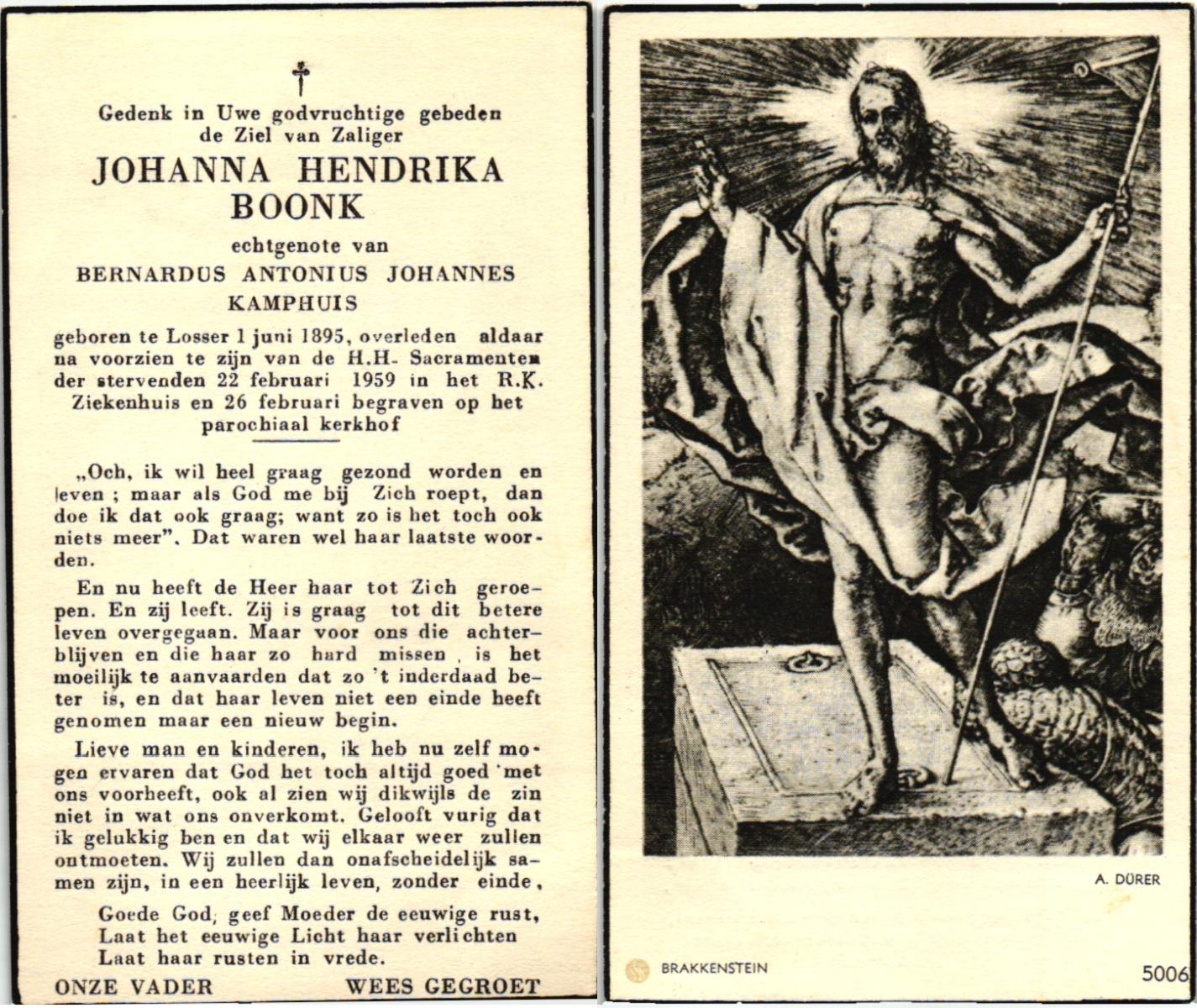 BOONK, , Johanna Hendrika, geboren op 01-06-1895 te Losser, overleden op 22-2-1959 te Losser op 63-jarige leeftijd, begraven op 26-2-1959 te Losser.
