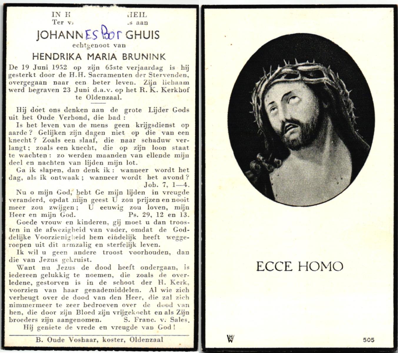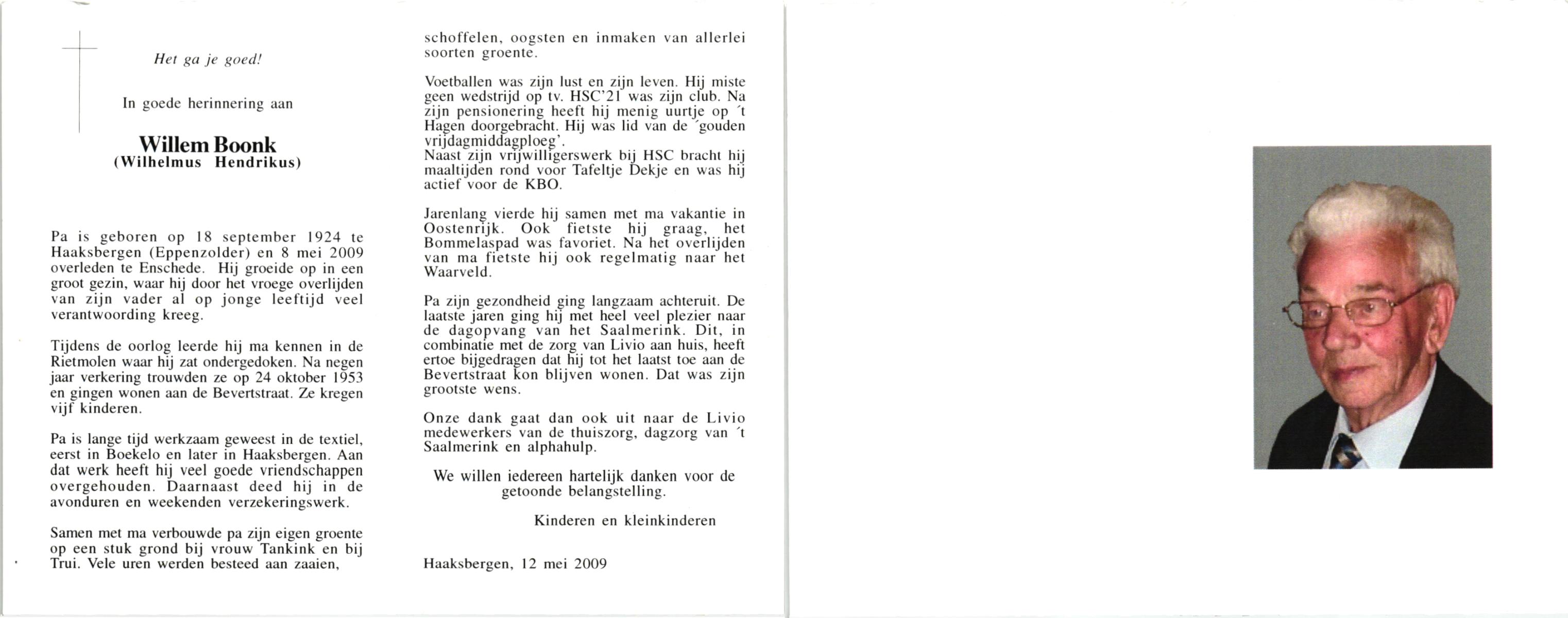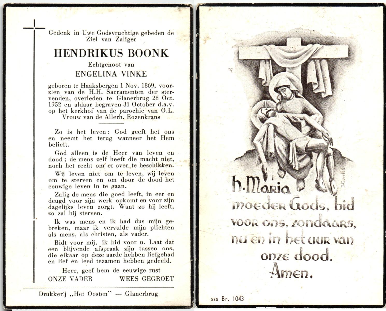 BOONK, Hendrikus, geboren op 01-11-1869 te Haaksbergen, overleden op 28-10-1952 te Glanerbrug op 82-jarige leeftijd, begraven op 31-10-1952 te Glanerbrug.