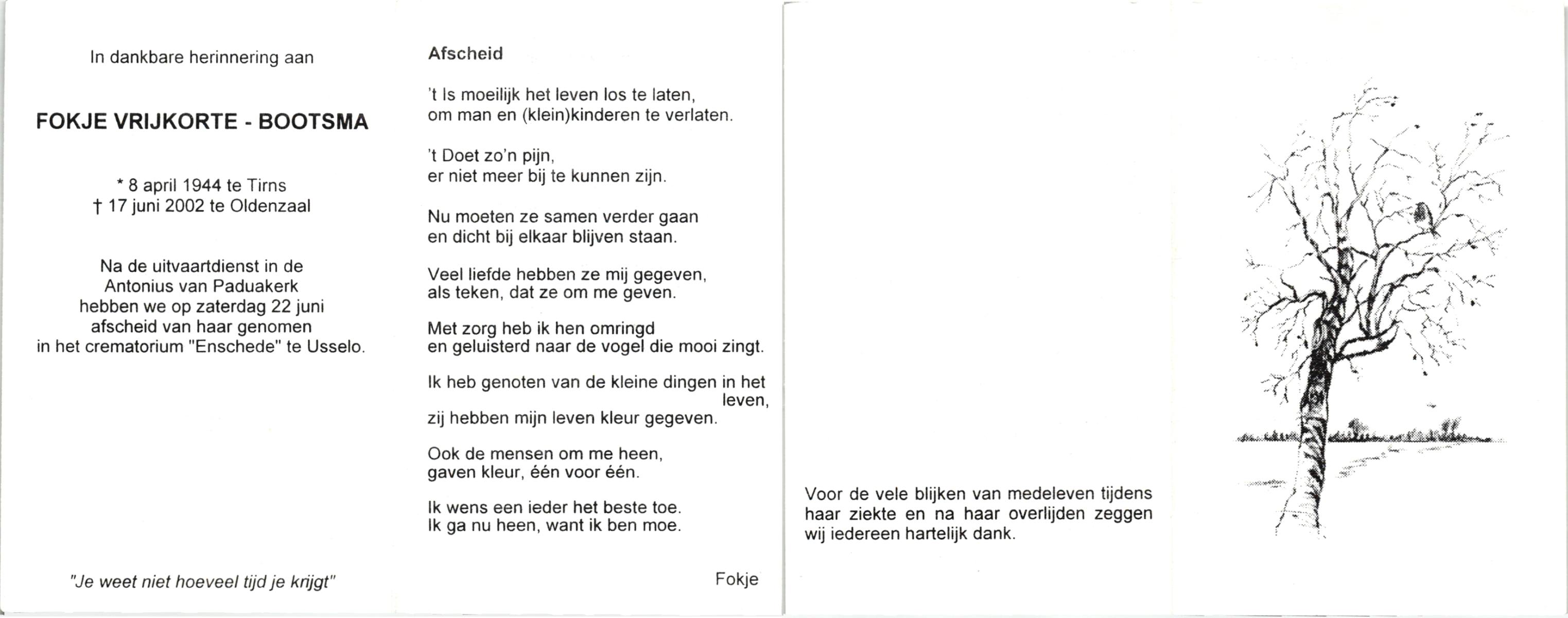 BOOTSMA, , Fokje, geboren op 8-4-1944 te Tirns, overleden op 17-6-2002 te Oldenzaal op 58-jarige leeftijd, gecremeerd op 22-6-2002 te Usselo.