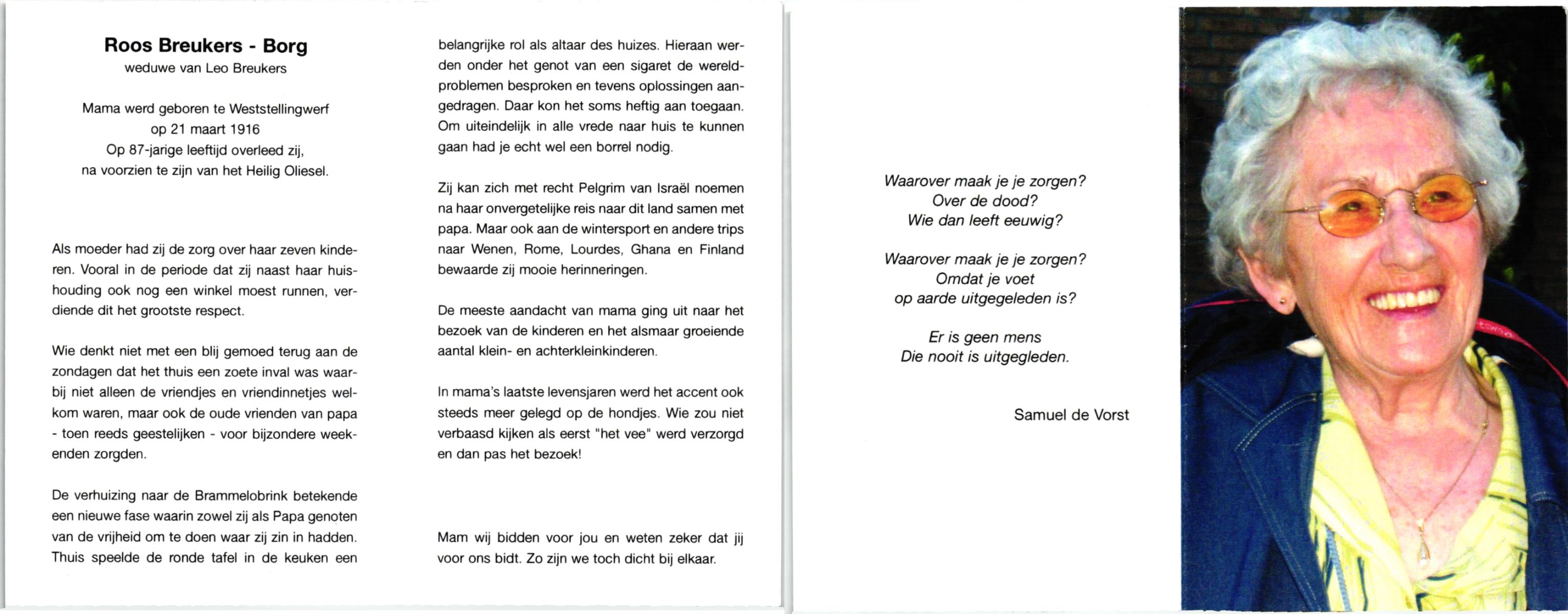 BORG, , Roos, geboren op 21-3-1916 te Weststellingwerf op 87-jarige leeftijd.