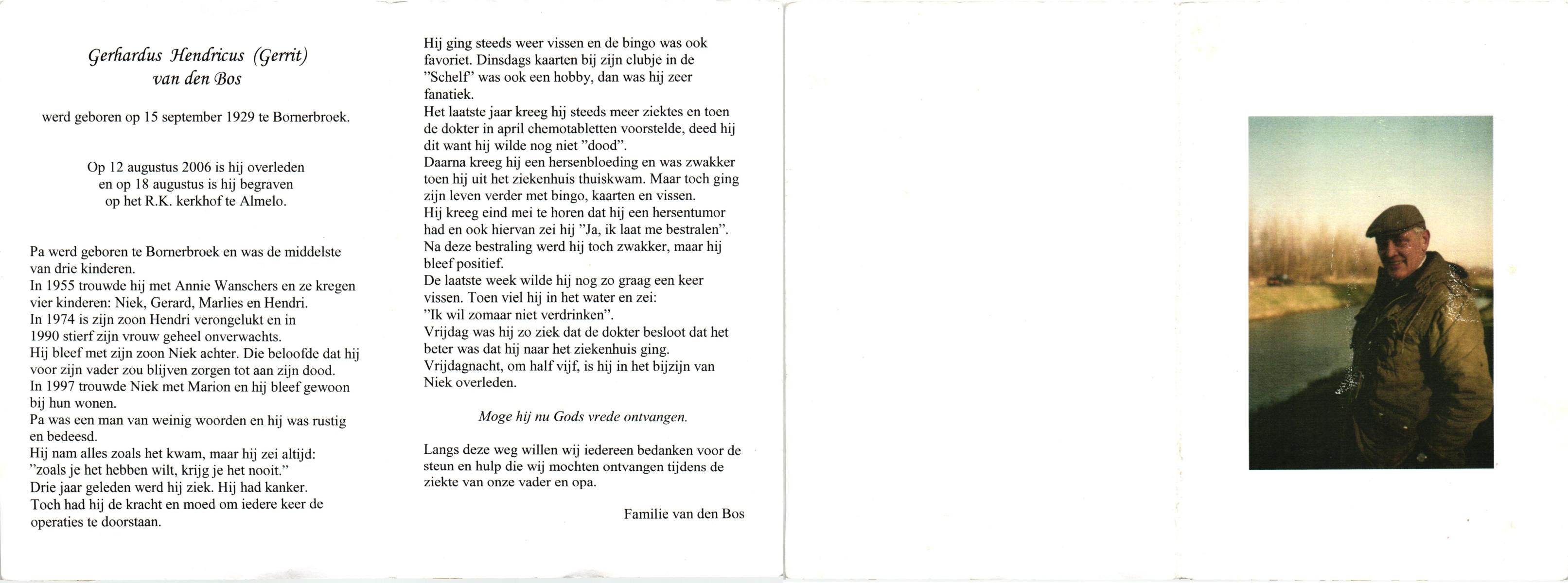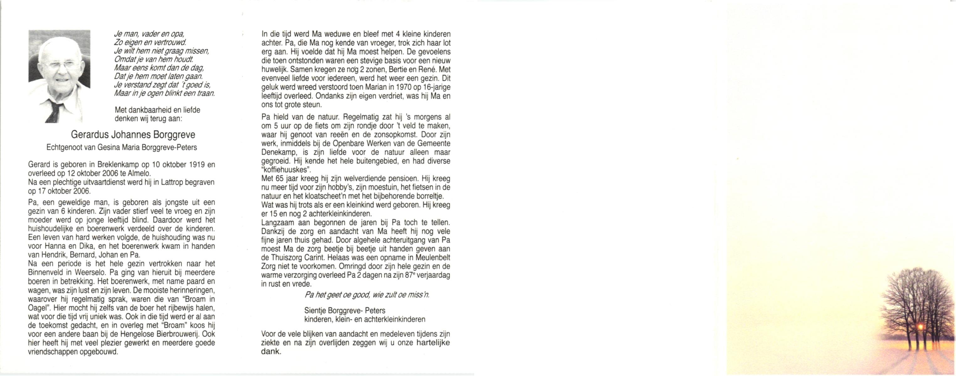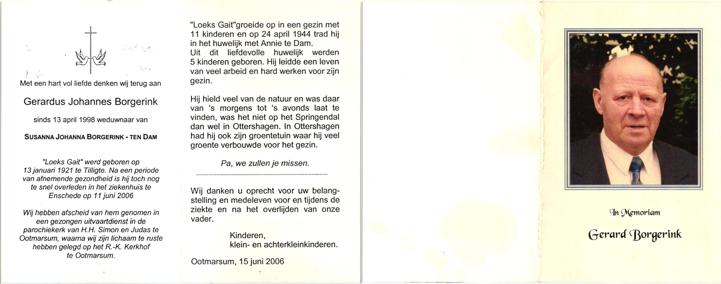 BORGERINK, , Gerardus Johannes, geboren op 13-1-1921 te Tilligte, overleden op 11-6-2006 te Enschede op 85-jarige leeftijd, begraven te Ootmarsum.