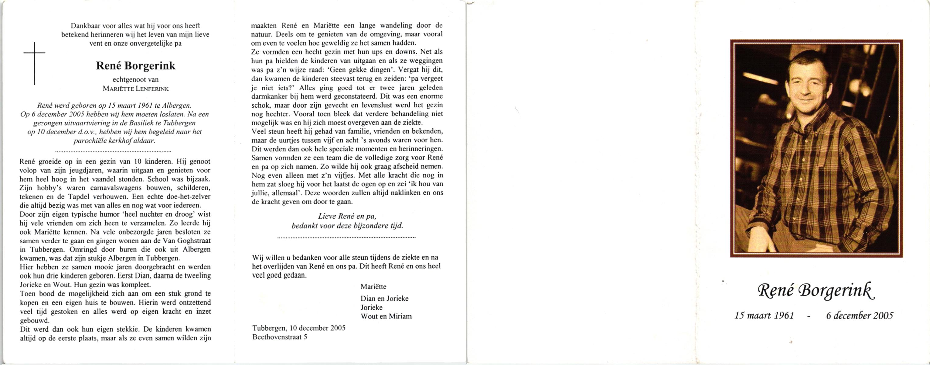 BORGERINK, , René, geboren op 15-3-1961 te Albergen, overleden op 6-12-2005 op 44-jarige leeftijd, begraven op 10-12-2005 te Tubbergen.