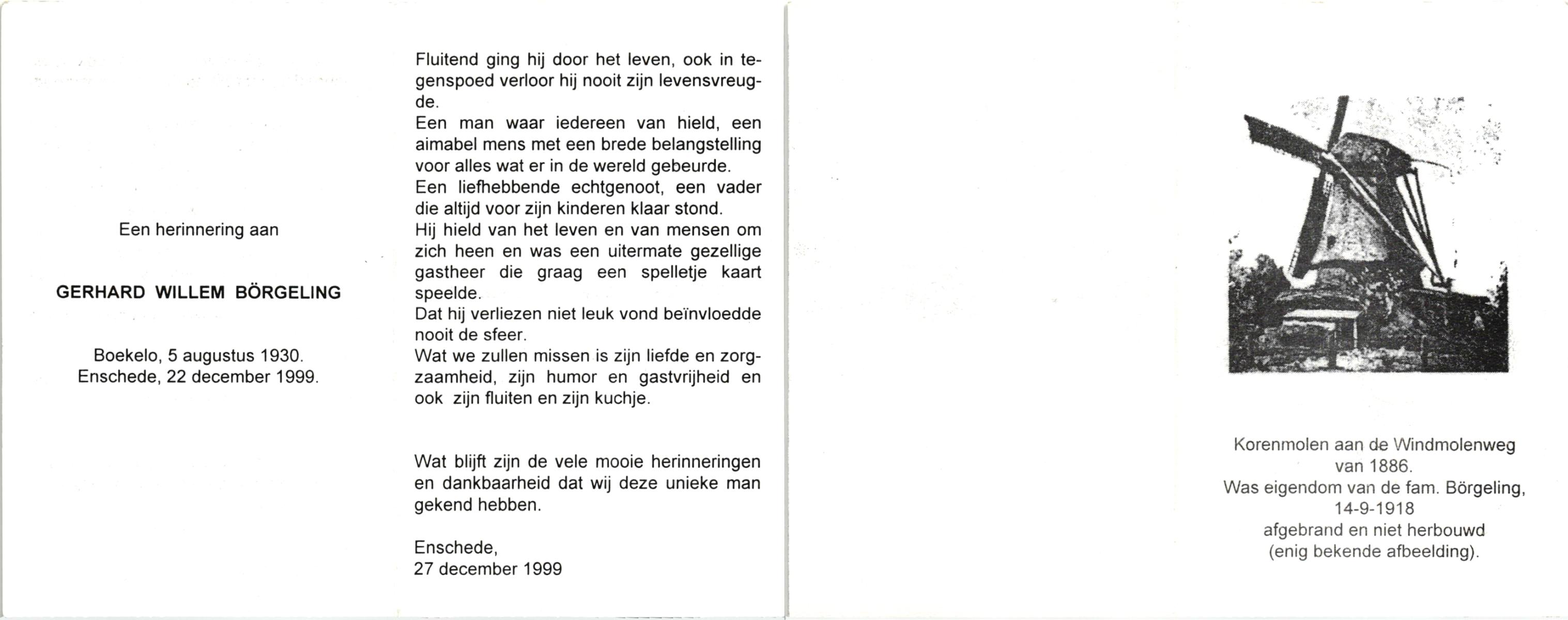 BÖRGERLING, , Gerhard Willem, geboren op 5-8-1930 te Boekelo, overleden op 22-12-1999 te Enschede op 69-jarige leeftijd.