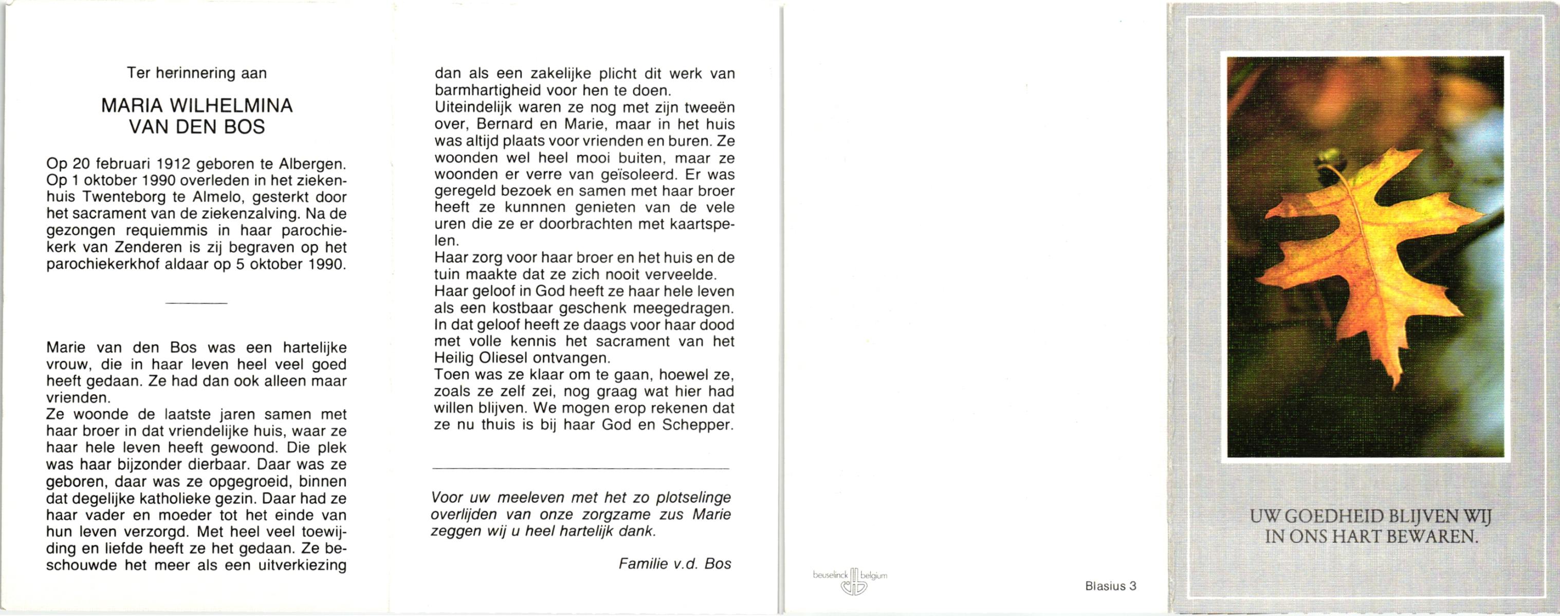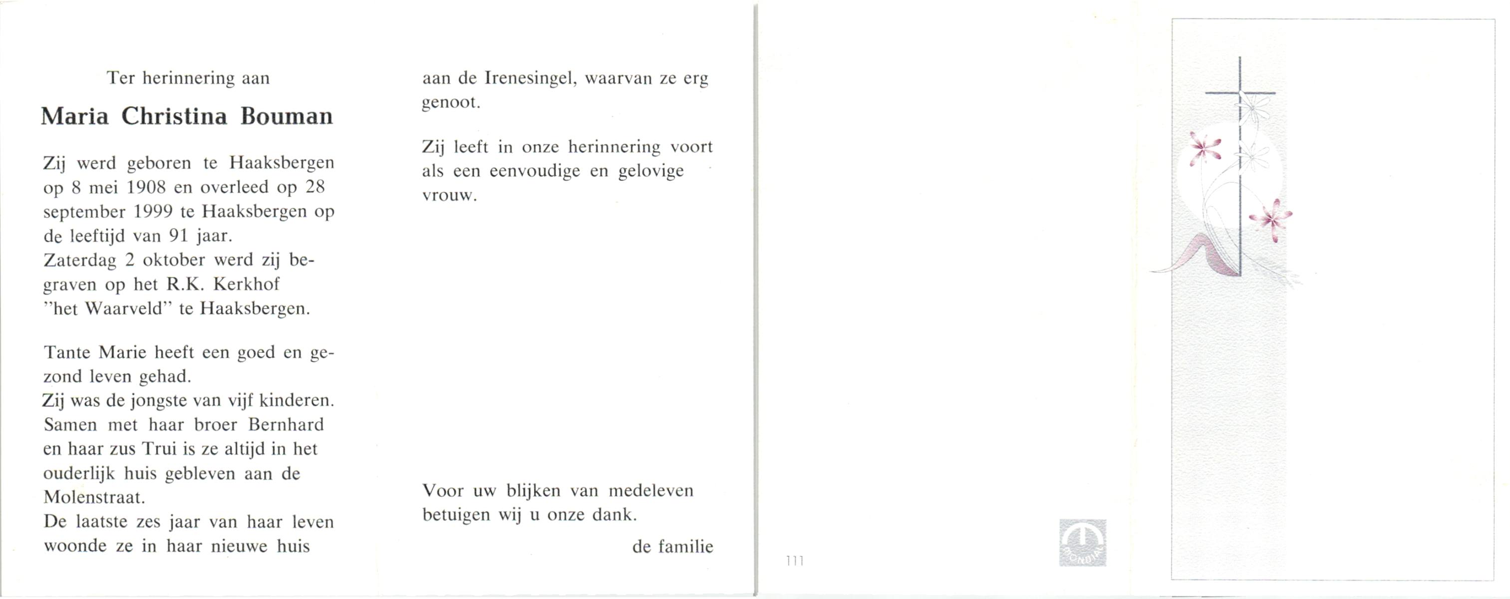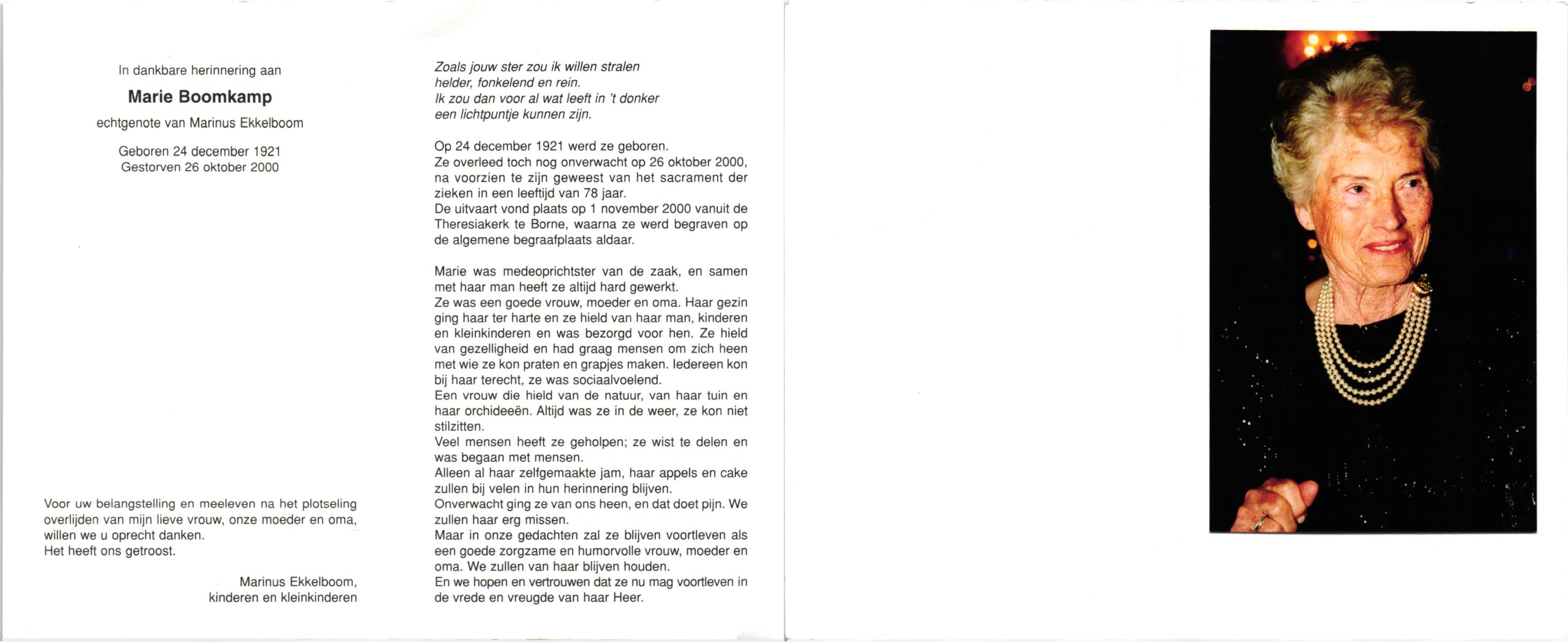 BOOMKAMP, Marie, geboren op 24-12-1921, overleden op 26-10-2000 op 78-jarige leeftijd, begraven op 1-11-2000 te Borne.