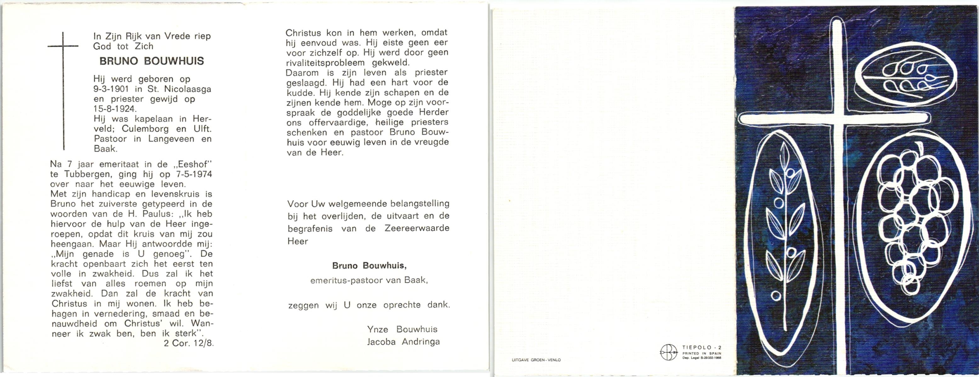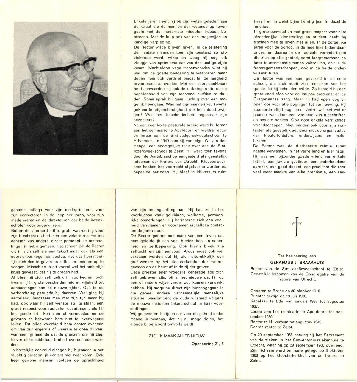 BRAAKHUIS (PRIESTER), Gerardus J., geboren op 30-10-1910 te Borne, overleden op 29-9-1968 te Utrecht op 57-jarige leeftijd, begraven op 3-10-1968 te Zeist.