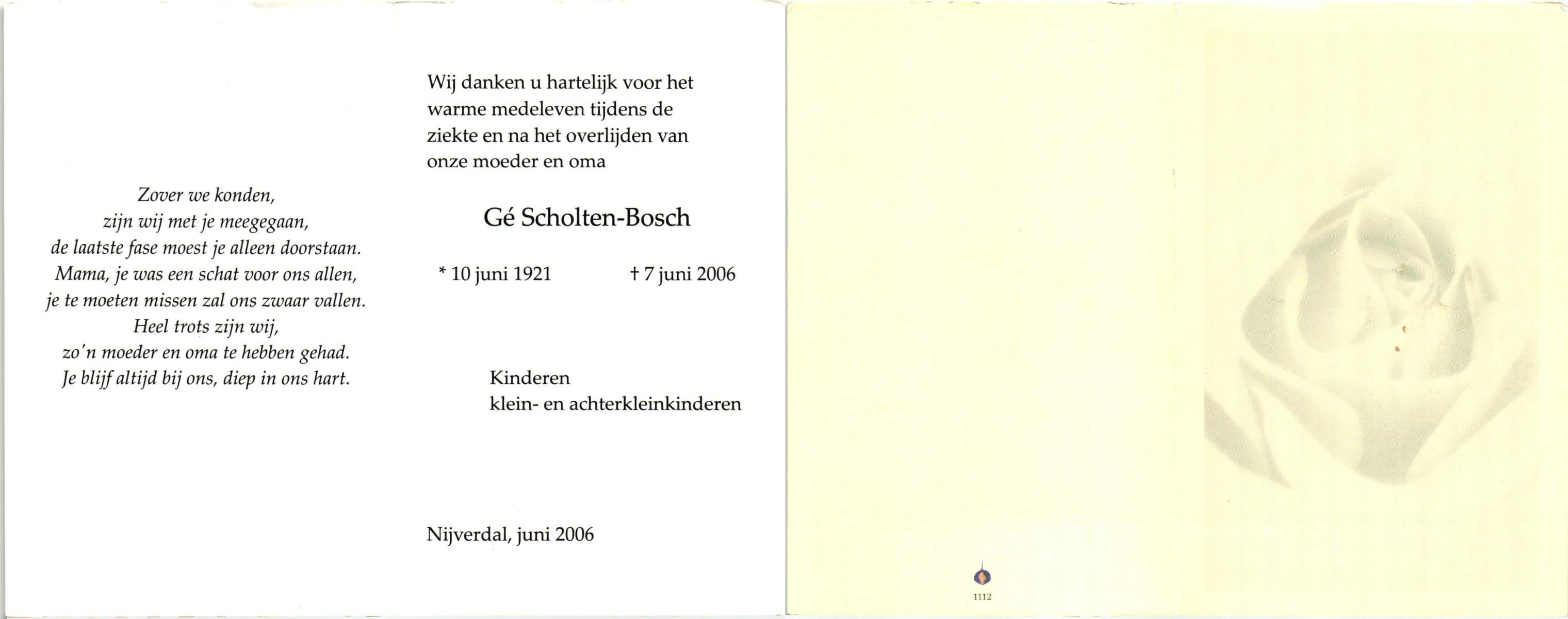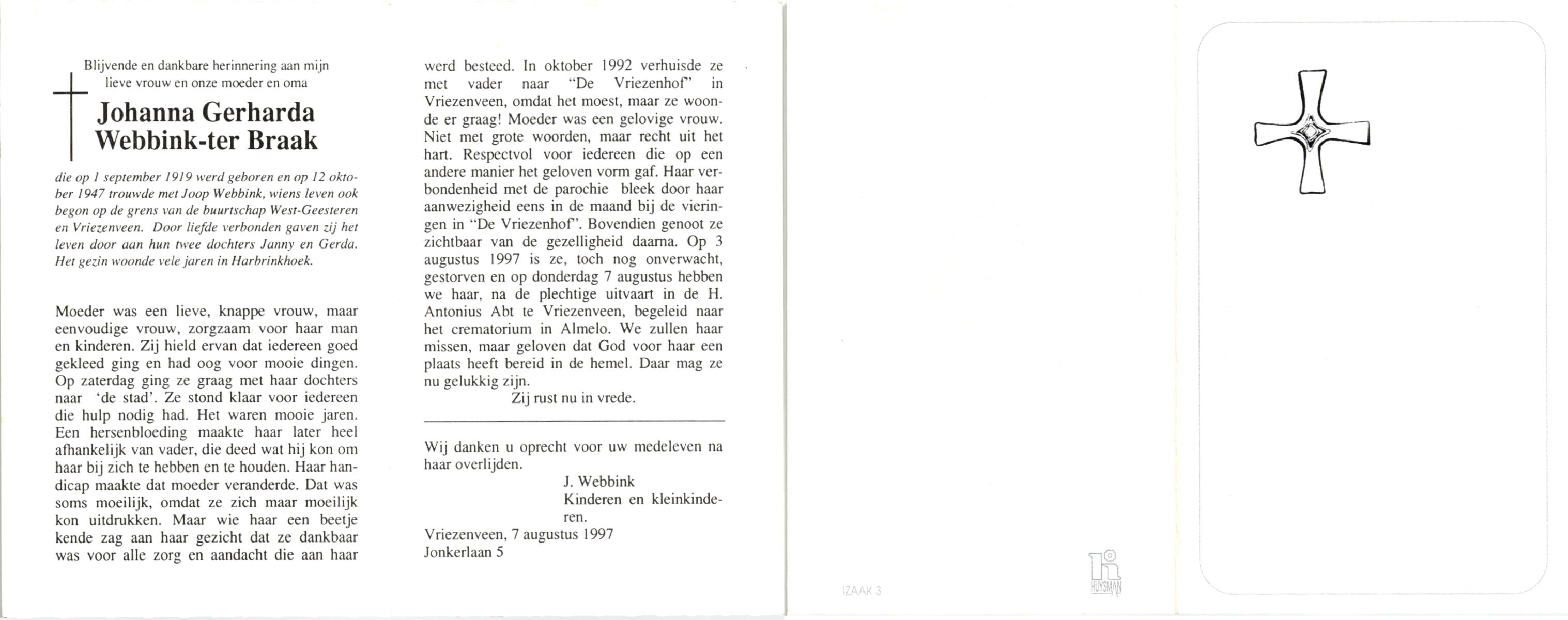 BRAAK, ter, Johanna Gerharda, geboren op 1-9-1919, overleden op 3-8-1997 op 77-jarige leeftijd, gecremeerd op 7-8-1997 te Almelo.