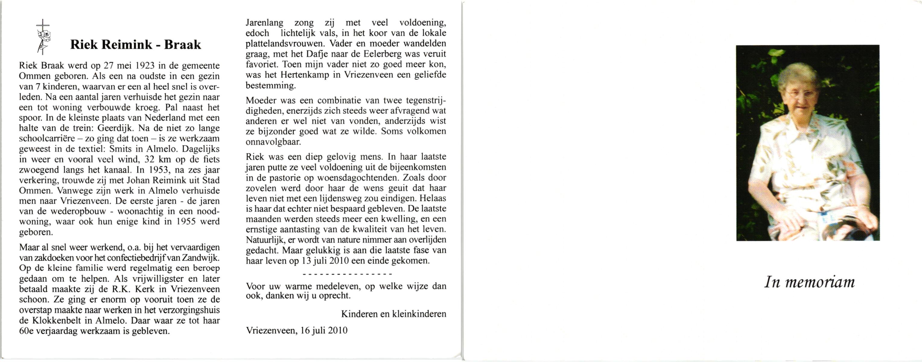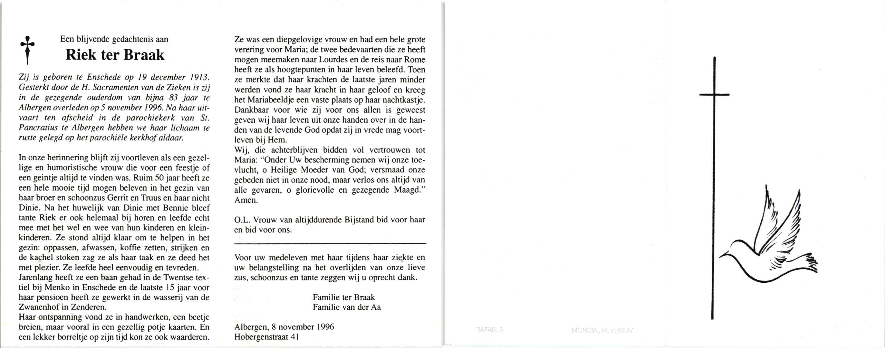BRAAK, ter, Riek, geboren op 19-12-1913 te Enschede, overleden op 5-11-1996 te Albergen op 82-jarige leeftijd, begraven te Albergen.