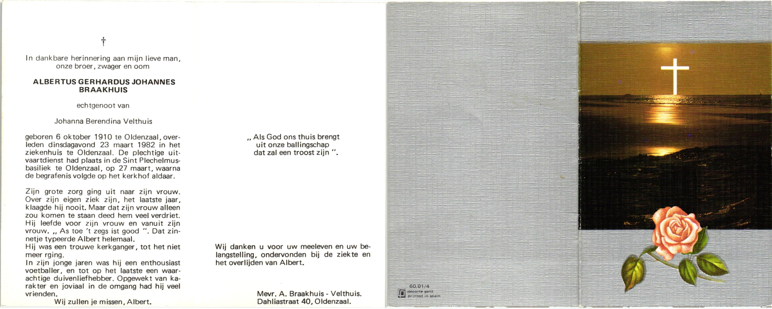 BRAAKHUIS, , Albertus Gerhardus Johannes, geboren op 6-10-1910 te Oldenzaal, overleden op 23-3-1982 te Oldenzaal op 71-jarige leeftijd, begraven op 27-3-1982 te Oldenzaal.