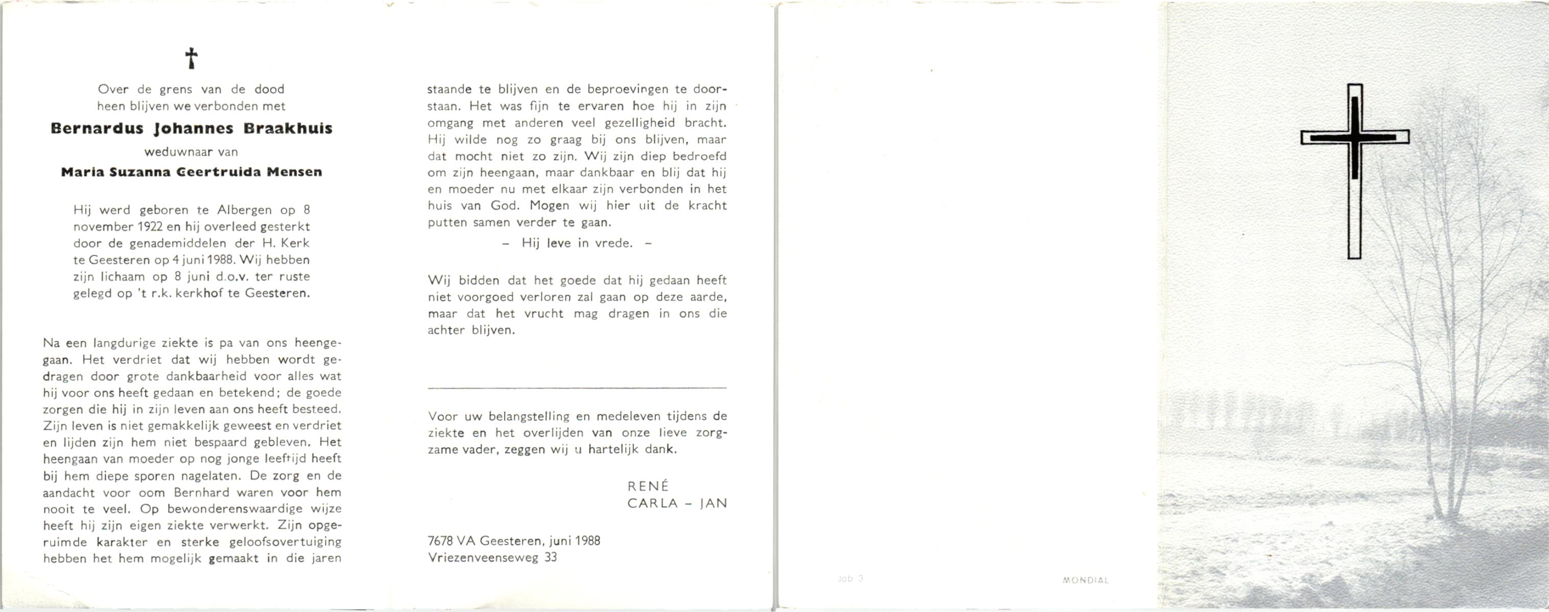 BRAAKHUIS, , Bernardus Johannes, geboren op 8-11-1922 te Albergen, overleden op 4-6-1988 te Geesteren op 65-jarige leeftijd, begraven op 8-6-1988 te Geesteren.