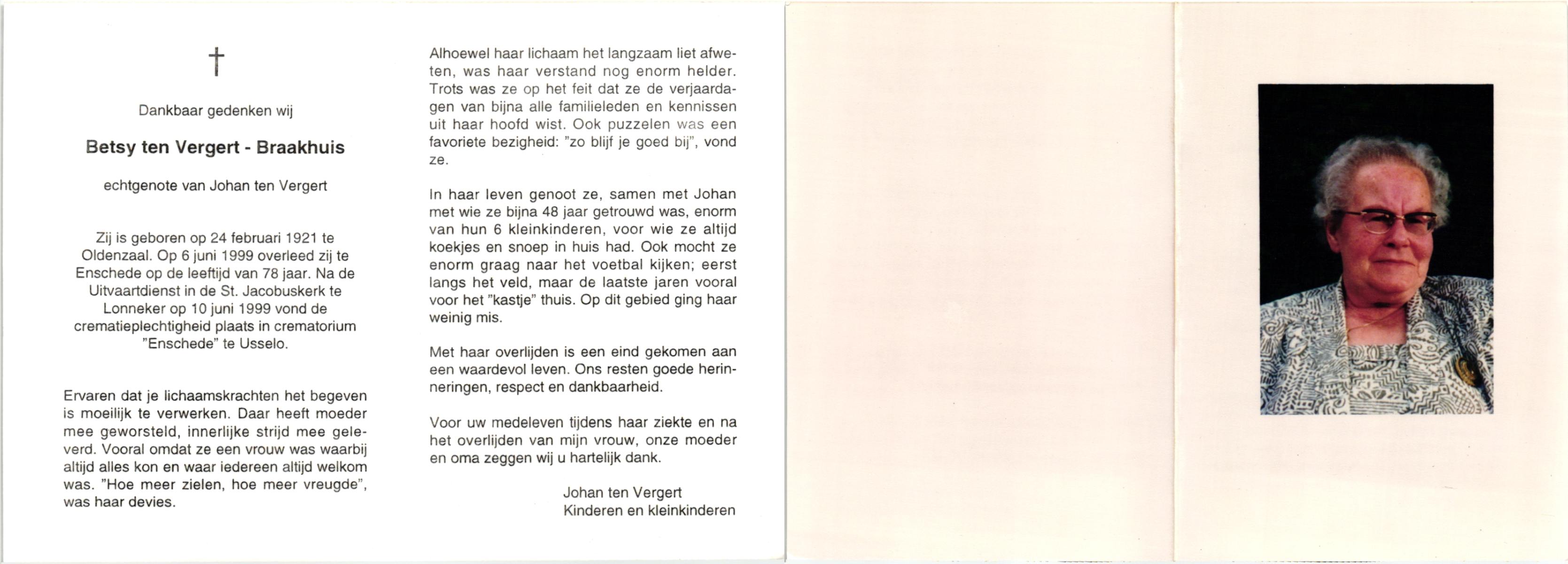 BRAAKHUIS, , Betsy, geboren op 24-2-1921 te Oldenzaal, overleden op 6-6-1999 te Enschede op 78-jarige leeftijd, gecremeerd op 10-6-1999 te Usselo.