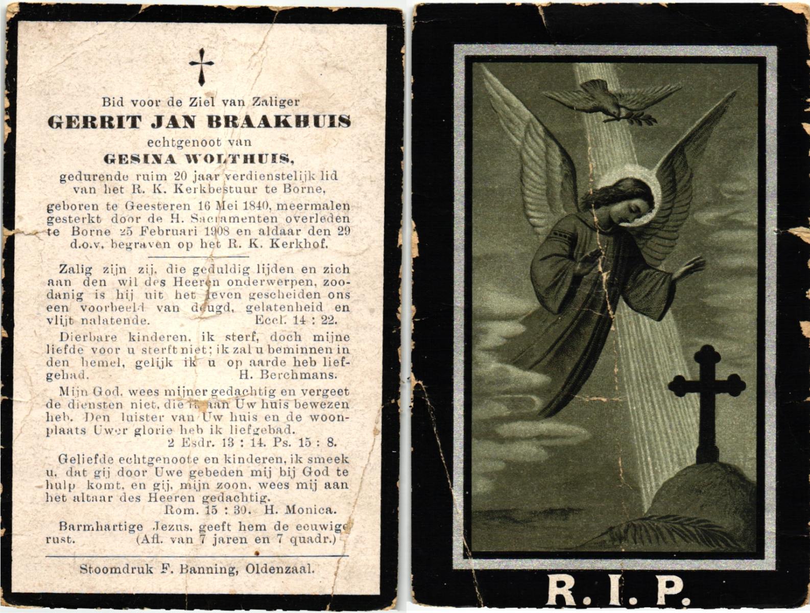 BRAAKHUIS, , Gerrit Jan, geboren op 16-05-1840 te Geesteren, overleden op 25-2-1908 te Borne op 67-jarige leeftijd, begraven op 29-2-1908 te Borne.