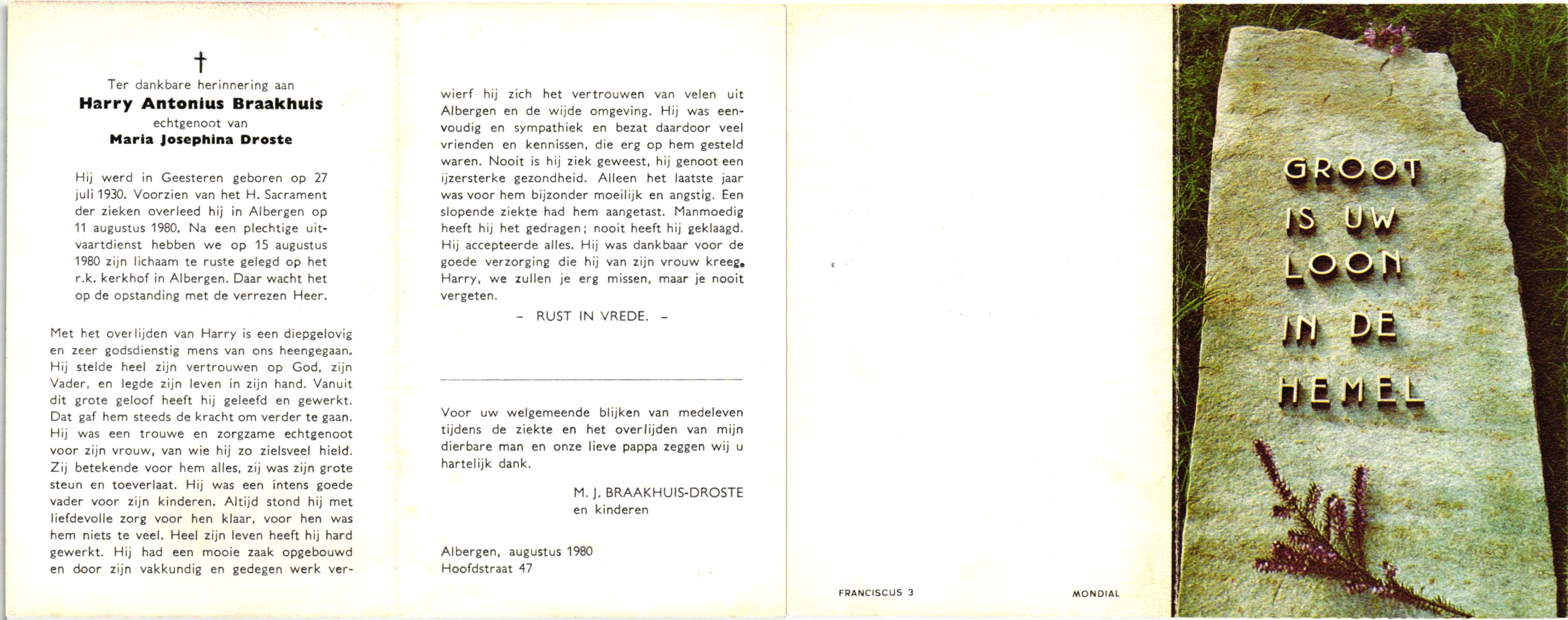 BRAAKHUIS, , Harry Antonius, geboren op 27-7-1930 te Geesteren, overleden op 11-8-1980 te Albergen op 50-jarige leeftijd, begraven op 15-8-1980 te Albergen.