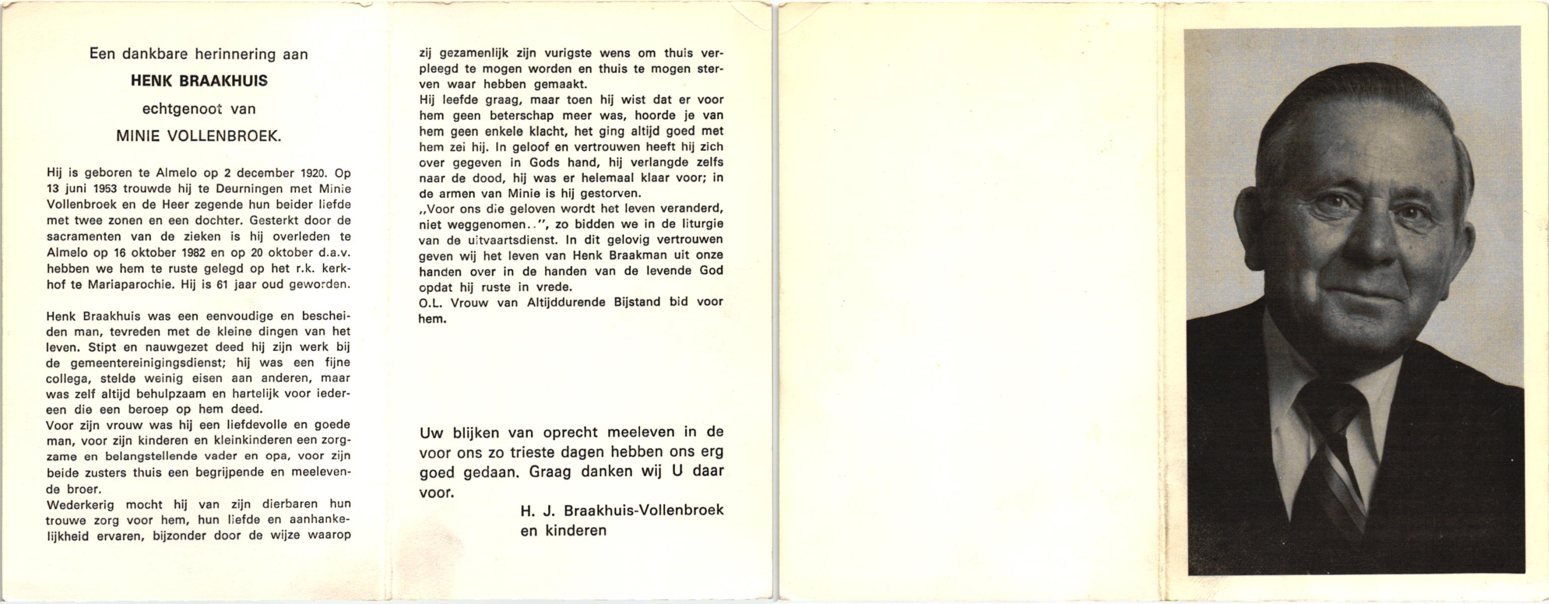 BRAAKHUIS, , Henk, geboren op 2-12-1920 te Almelo, overleden op 16-10-1982 te Almelo op 62-jarige leeftijd, begraven op 20-10-1982 te Mariaparochie.