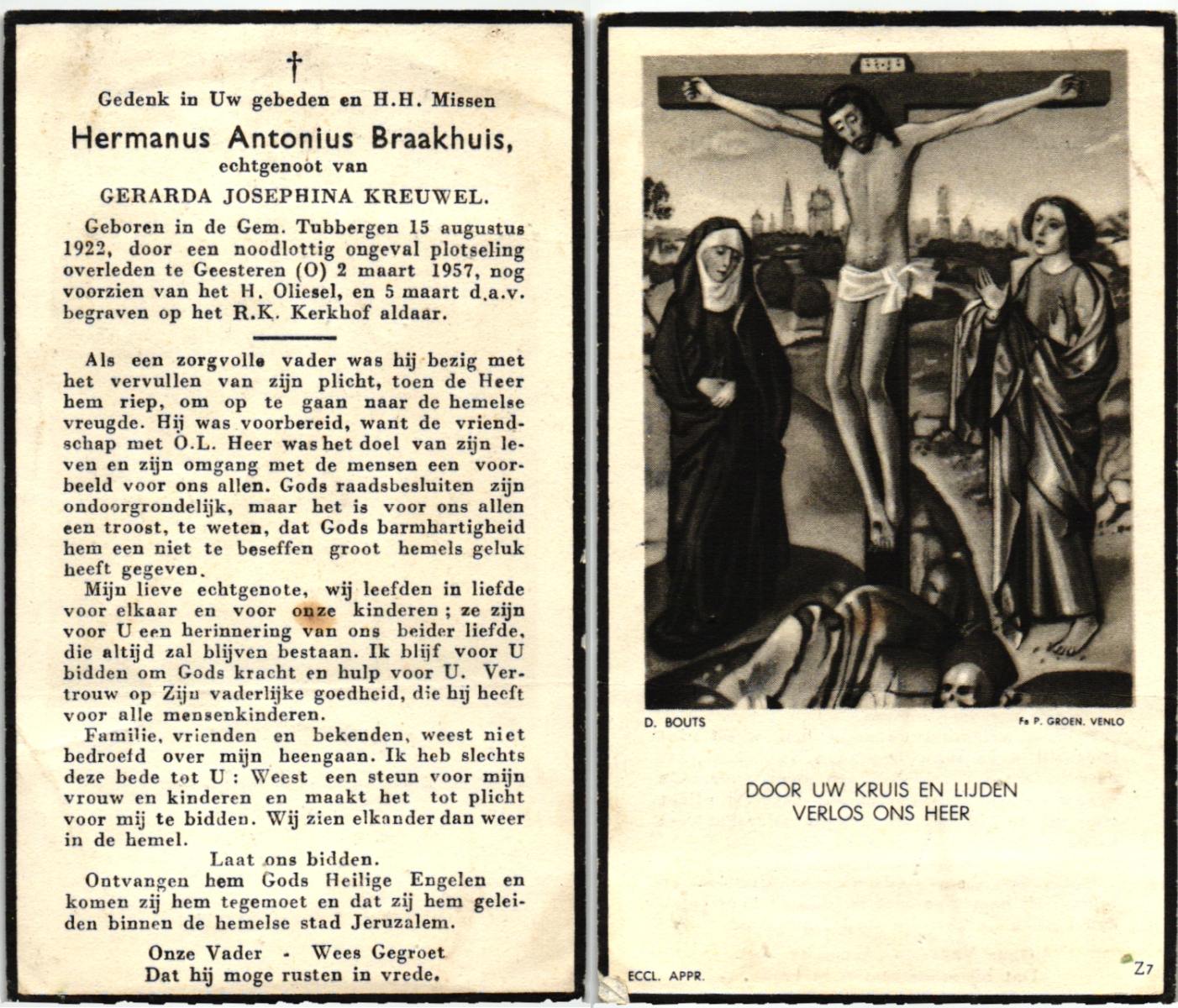 BRAAKHUIS, , Hermanus Antonius, geboren op 15-8-1922 te Tubbergen, overleden op 2-3-1957 te Geesteren op 34-jarige leeftijd, begraven op 5-3-1957 te Geesteren.