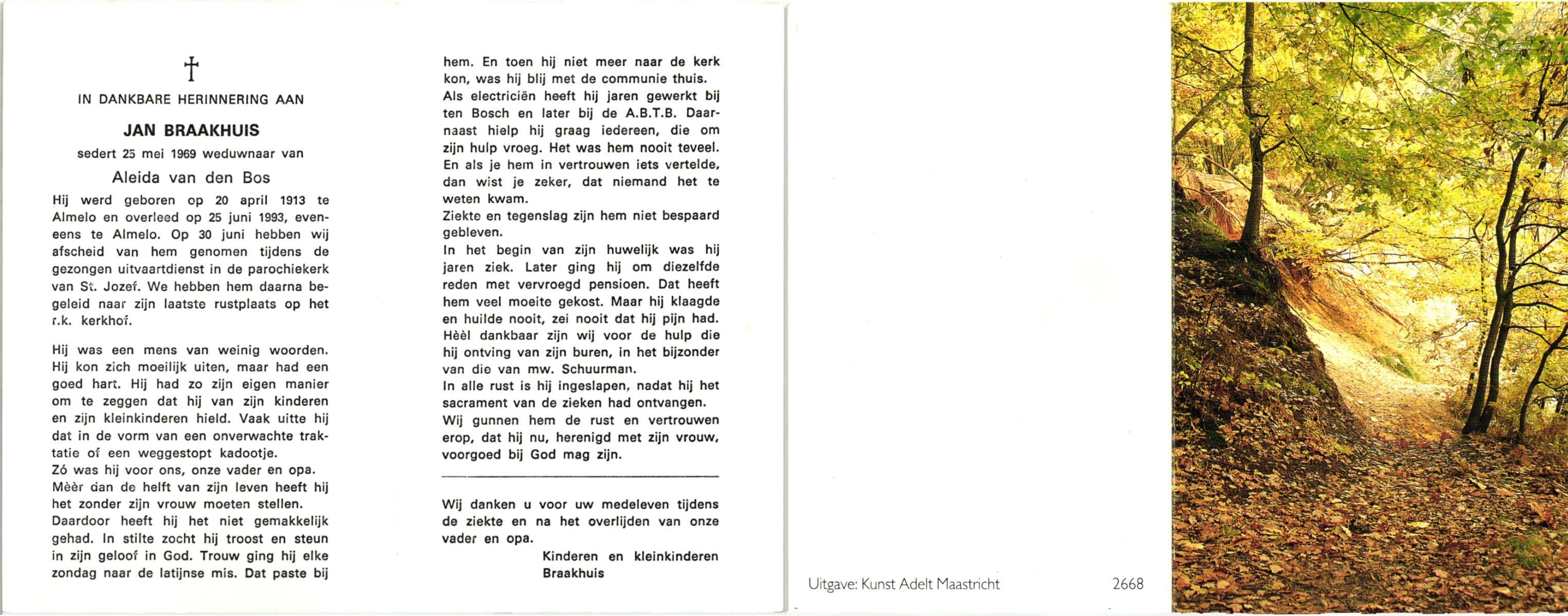 BRAAKHUIS, , Jan, geboren op 20-4-1913 te Almelo, overleden op 25-6-1993 te Almelo op 80-jarige leeftijd, begraven op 30-6-1993 te Almelo, rk.