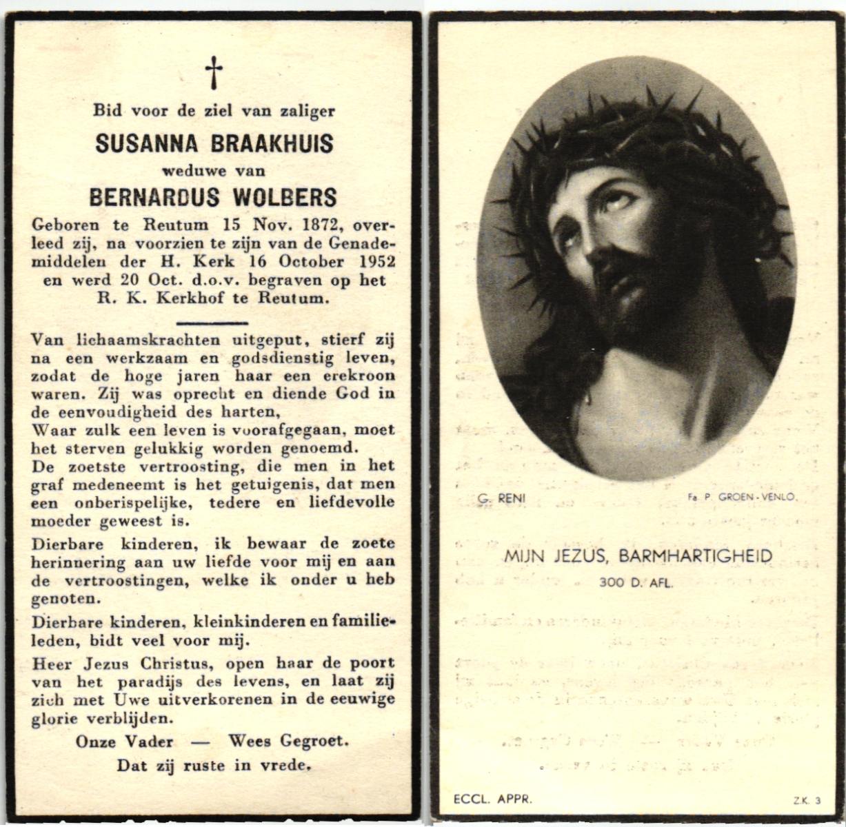 BRAAKHUIS, , Susanna, geboren op 15-11-1872 te Reutum, overleden op 16-10-1952 op 79-jarige leeftijd, begraven op 20-10-1952 te Reutum.