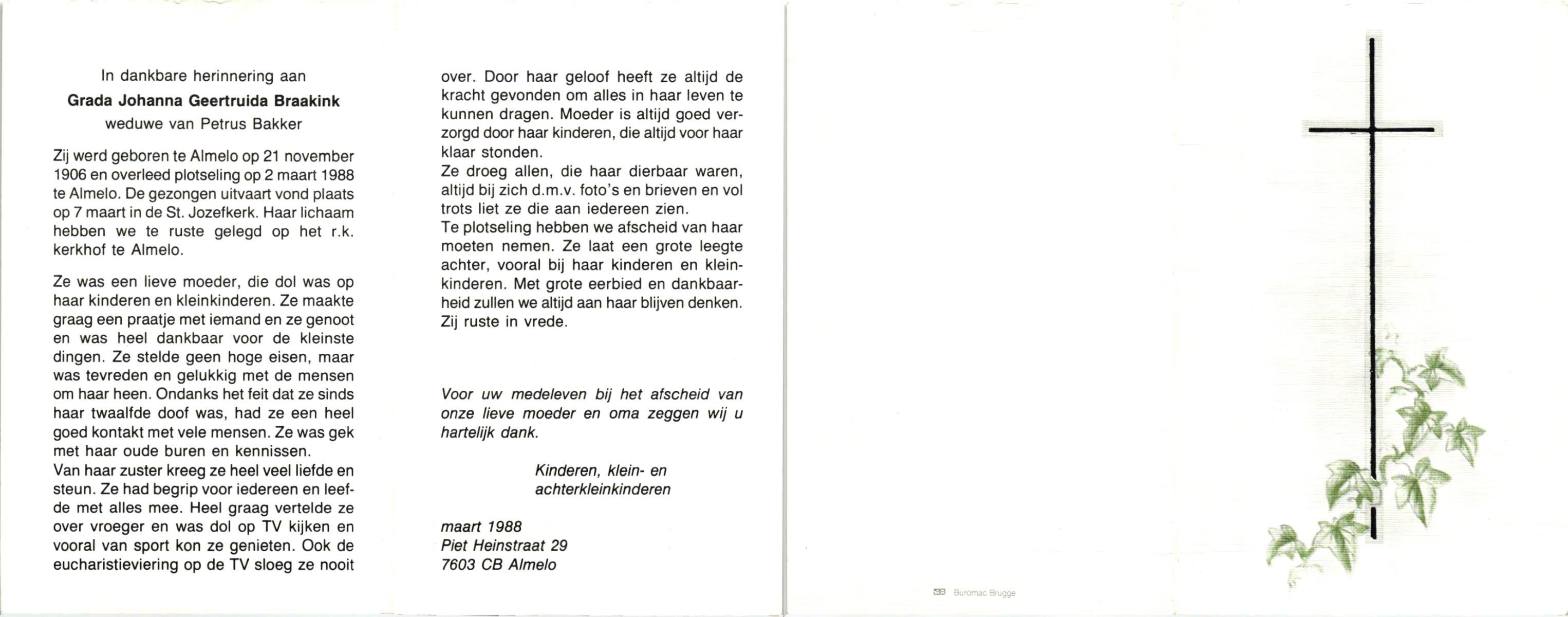 BRAAKINK, , Grada Johanna Geertruida, geboren op 21-11-1906 te Almelo, overleden op 2-3-1988 te Almelo op 81-jarige leeftijd, begraven op 7-3-1988 te Almelo.