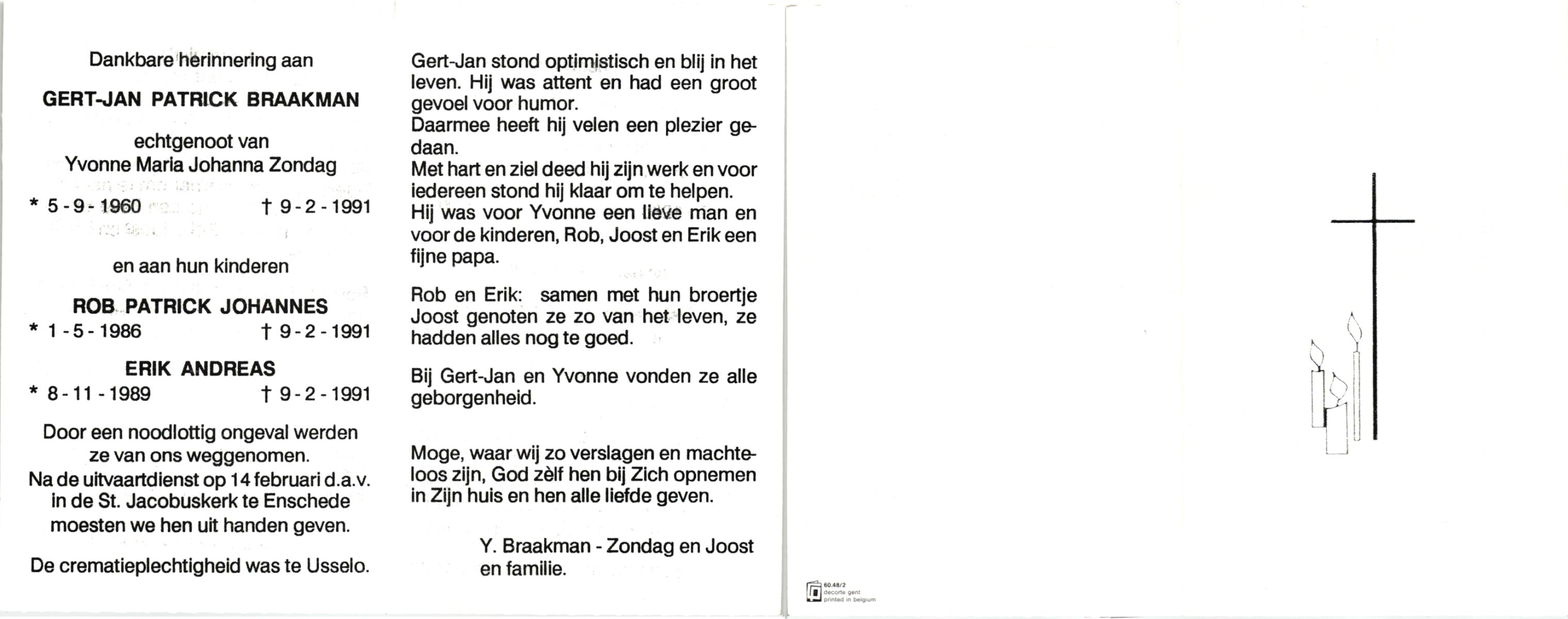 BRAAKMAN, , Gert-Jan Patrick, geboren op 5-9-1960, overleden op 9-2-1991 op 30-jarige leeftijd, gecremeerd op 14-2-1991 te Usselo.