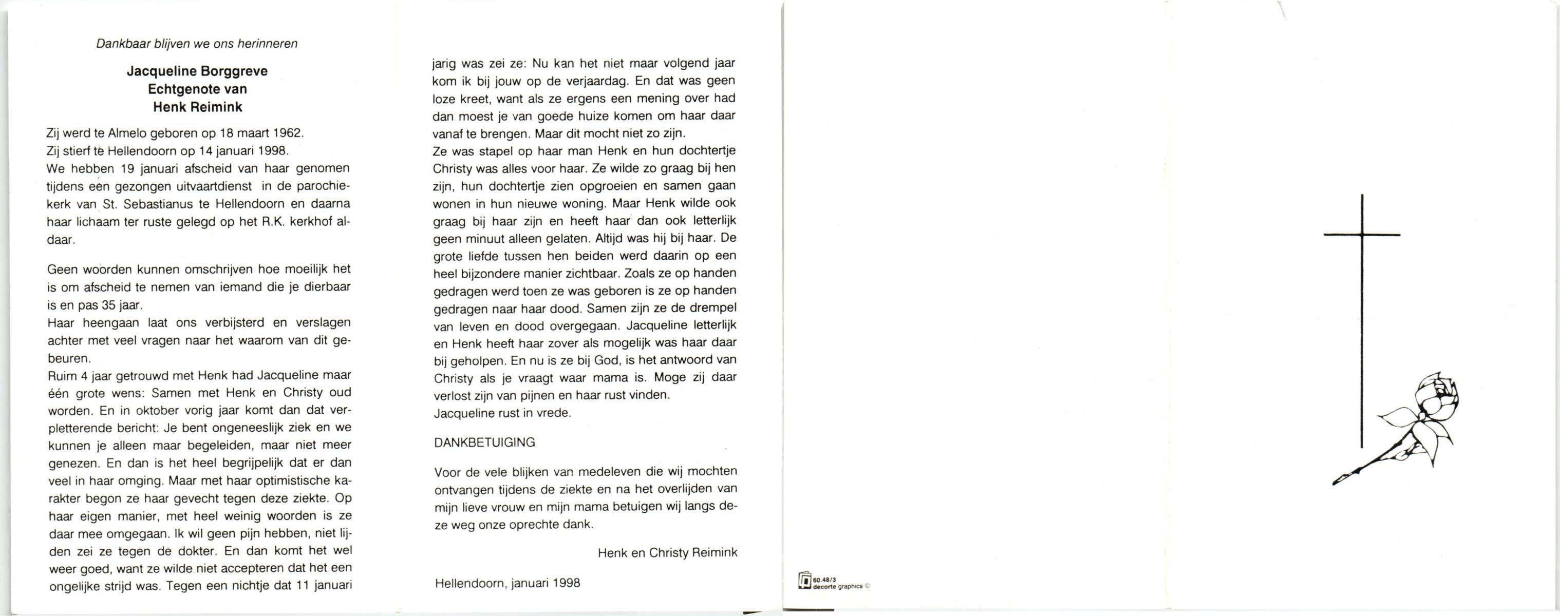 BORGGREVE, Jacqueline, geboren op 18-3-1962 te Almelo, overleden op 14-1-1998 te Hellendoorn op 35-jarige leeftijd, begraven op 19-1-1998 te Hellendoorn, rk.