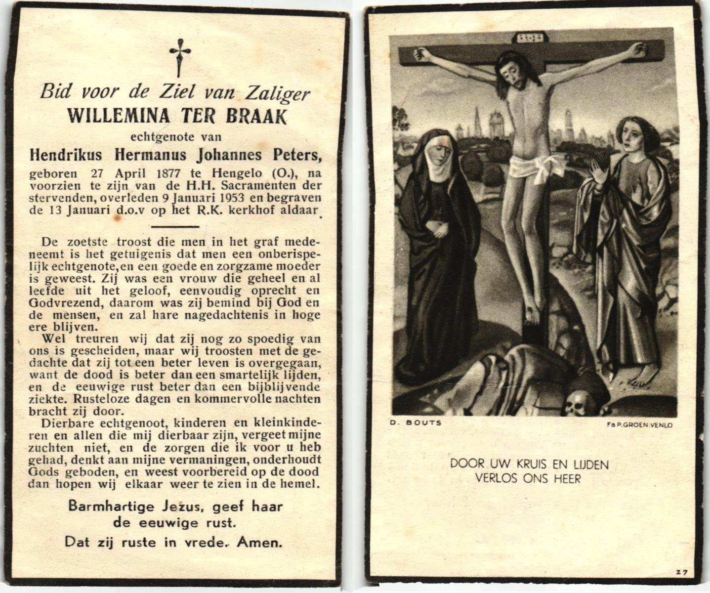 BRAAK, ter, Willemina, geboren op 27-04-1877 te Hengelo, overleden op 9-1-1953 te Hengelo op 75-jarige leeftijd, begraven op 13-1-1953 te Hengelo.