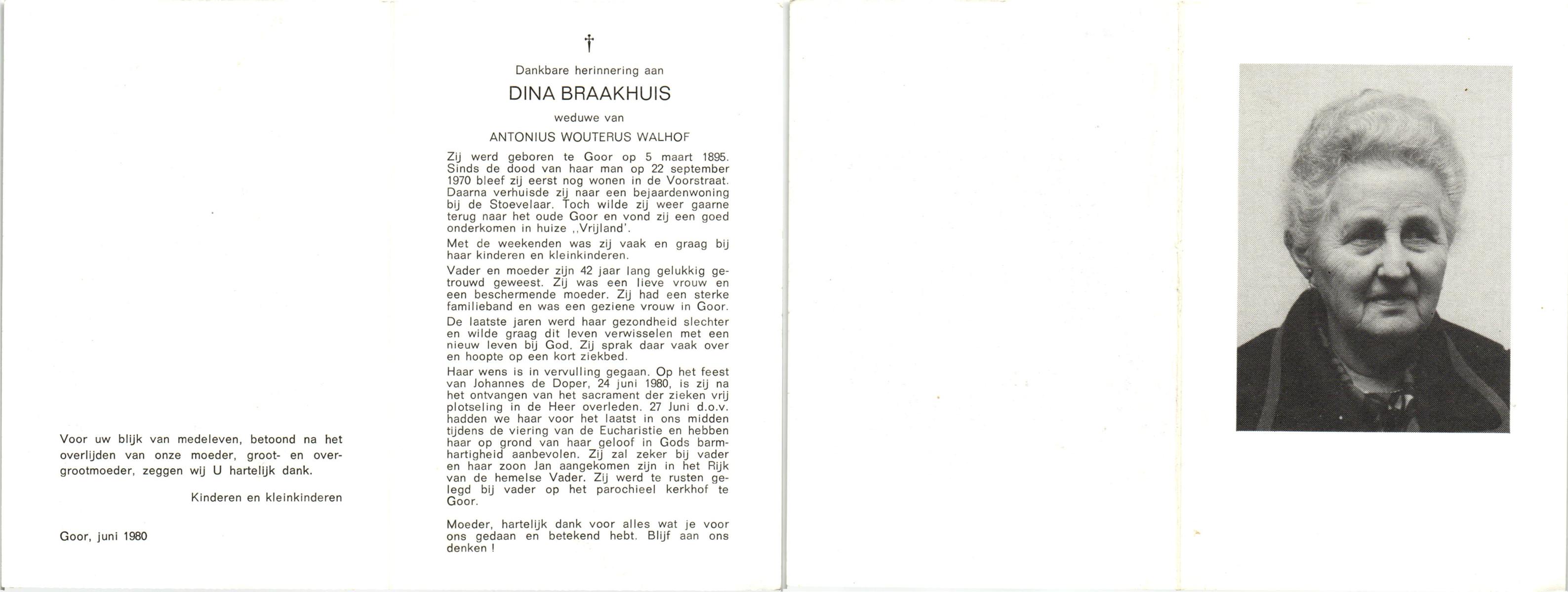 BRAAKHUIS, Dina, geboren op 05-03-1895 te Goor, overleden op 24-6-1980 op 85-jarige leeftijd, begraven op 27-6-1980 te Goor.