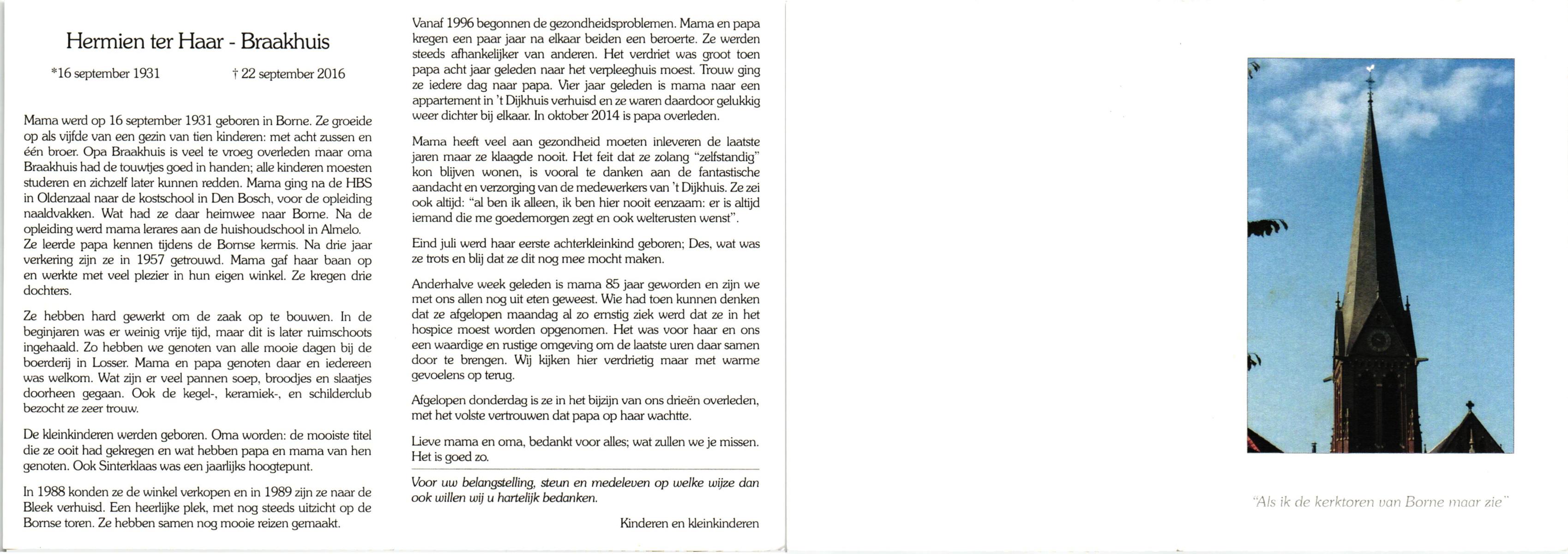 BRAAKHUIS, Hermien, geboren op 16-9-1931 te Borne, overleden op 22-9-2016 op 85-jarige leeftijd.