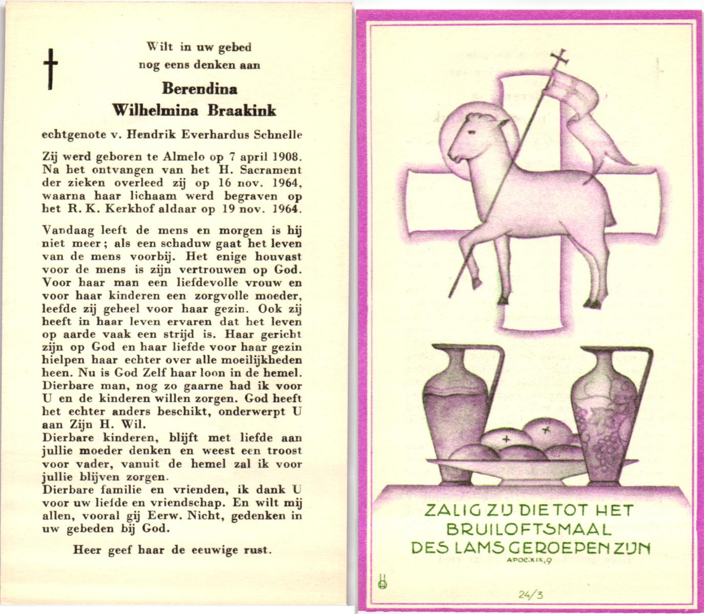 BRAAKINK, Berendina Wilhelmina, geboren op 7-4-1908 te Almelo, overleden op 16-11-1964 op 56-jarige leeftijd, begraven op 19-11-1964 te Almelo.