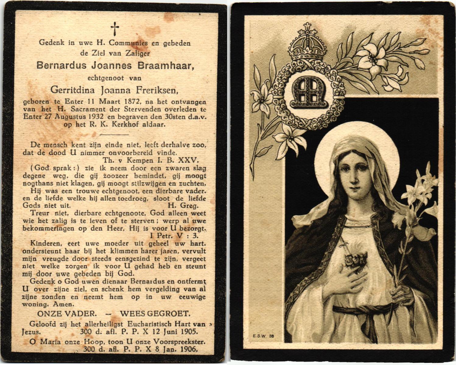 BRAAMHAAR, Bernardus Johannes, geboren op 11-03-1872 te Wierden, Enter, overleden op 27-8-1932 te Wierden, Enter op 60-jarige leeftijd, begraven op 30-8-1932 te Wierden, Enter.
