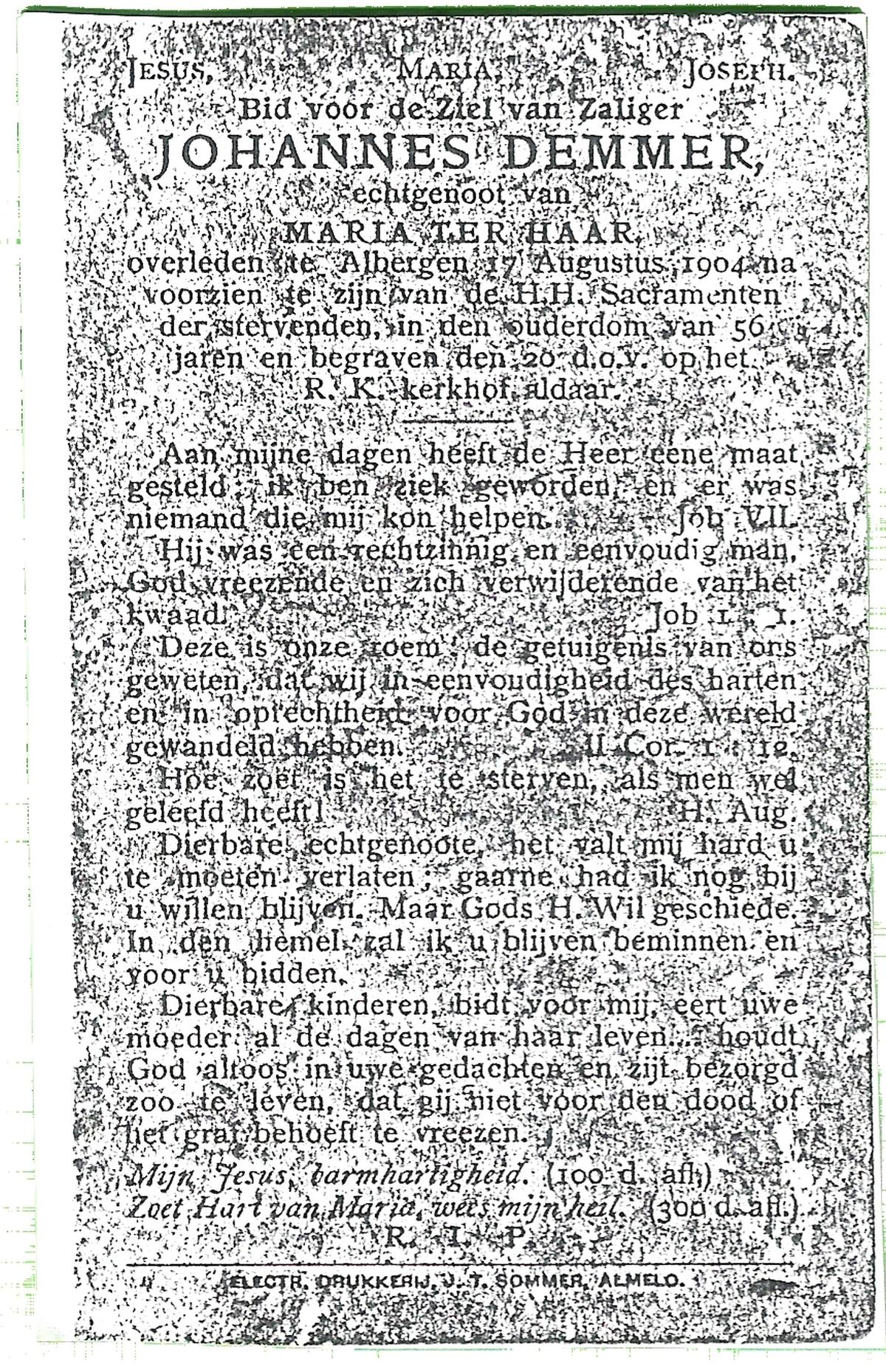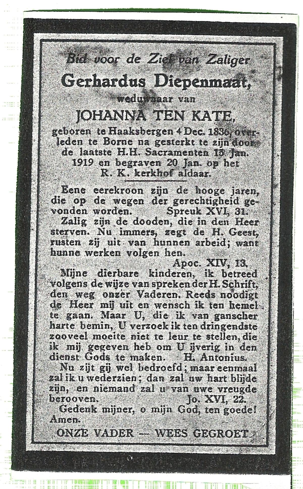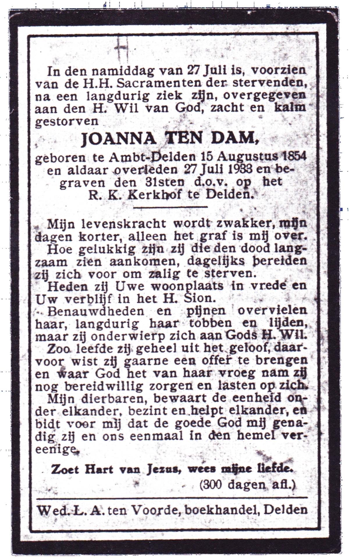 DAM, ten, Joanna, geboren op 15-08-1854 te Delden, Ambt, overleden op 27-7-1933 te Delden, Ambt op 78-jarige leeftijd, begraven op 31-7-1933 te Delden.