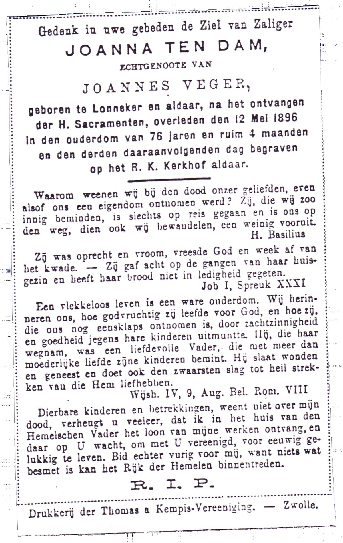 DAM, Ten, Joanna, geboren te Lonneker, overleden op 12-05-1896 te Lonneker op 76-jarige leeftijd, begraven op 15-05-1896 te Lonneker.