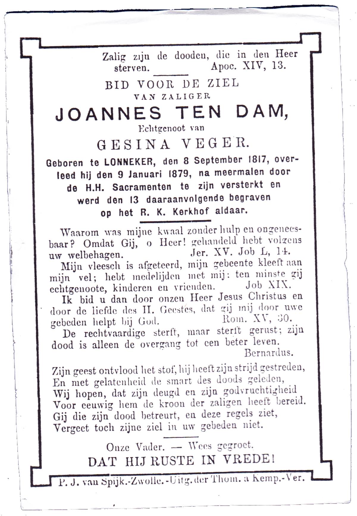 DAM, Ten, Joannes, geboren op 08-09-1817 te Lonneker, overleden op 09-01-1879 op 61-jarige leeftijd, begraven op 13-01-1879 te Lonneker.