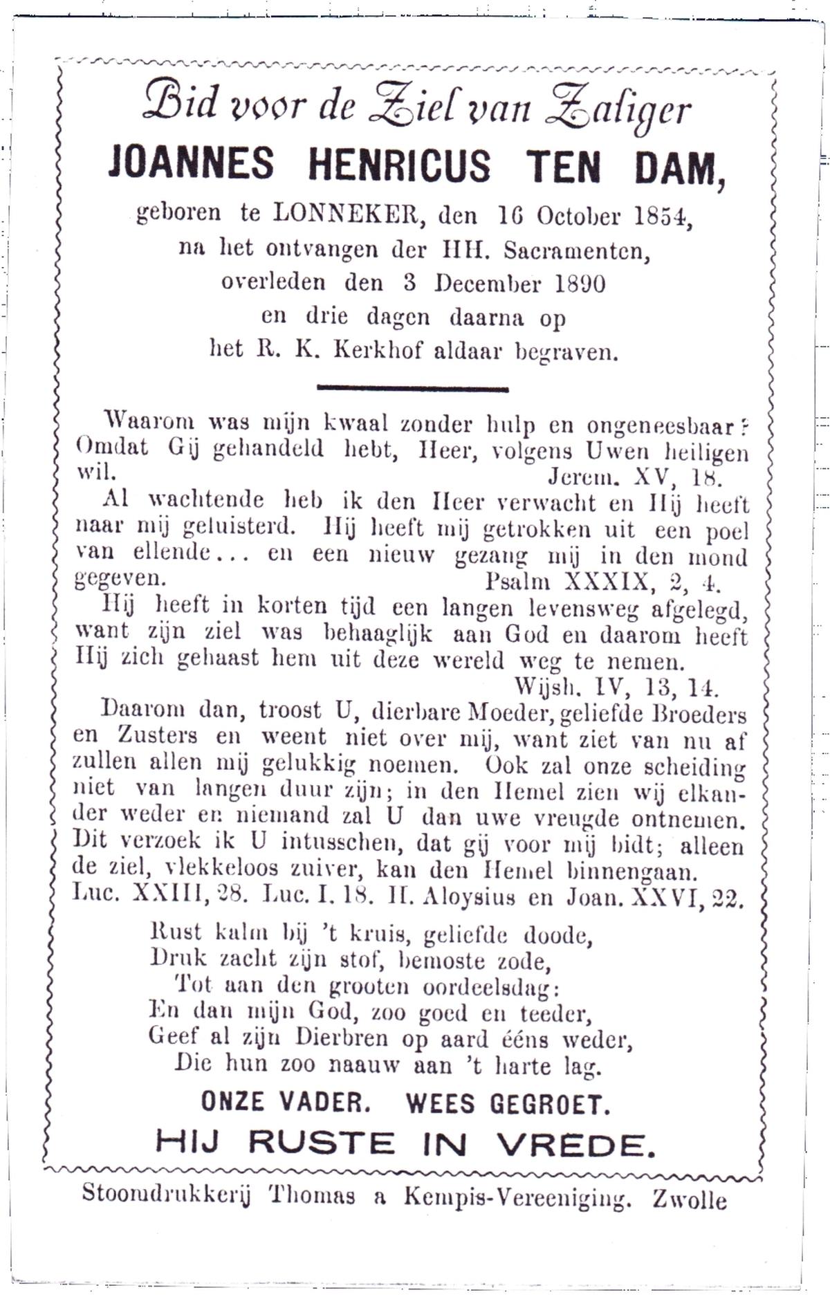 DAM, Ten, Joannes Henricus, geboren op 16-10-1854 te Lonneker, overleden op 03-12-1890 op 36-jarige leeftijd, begraven op 06-12-1890 te Lonneker.